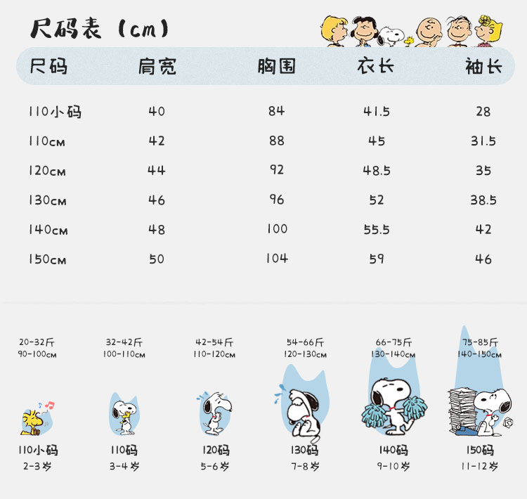 | 尺码 | 衣长(cm) | 肩宽(cm) | 身高(cm) | 袖长(cm) | 适合年龄 | 胸围(cm) | 号型 |