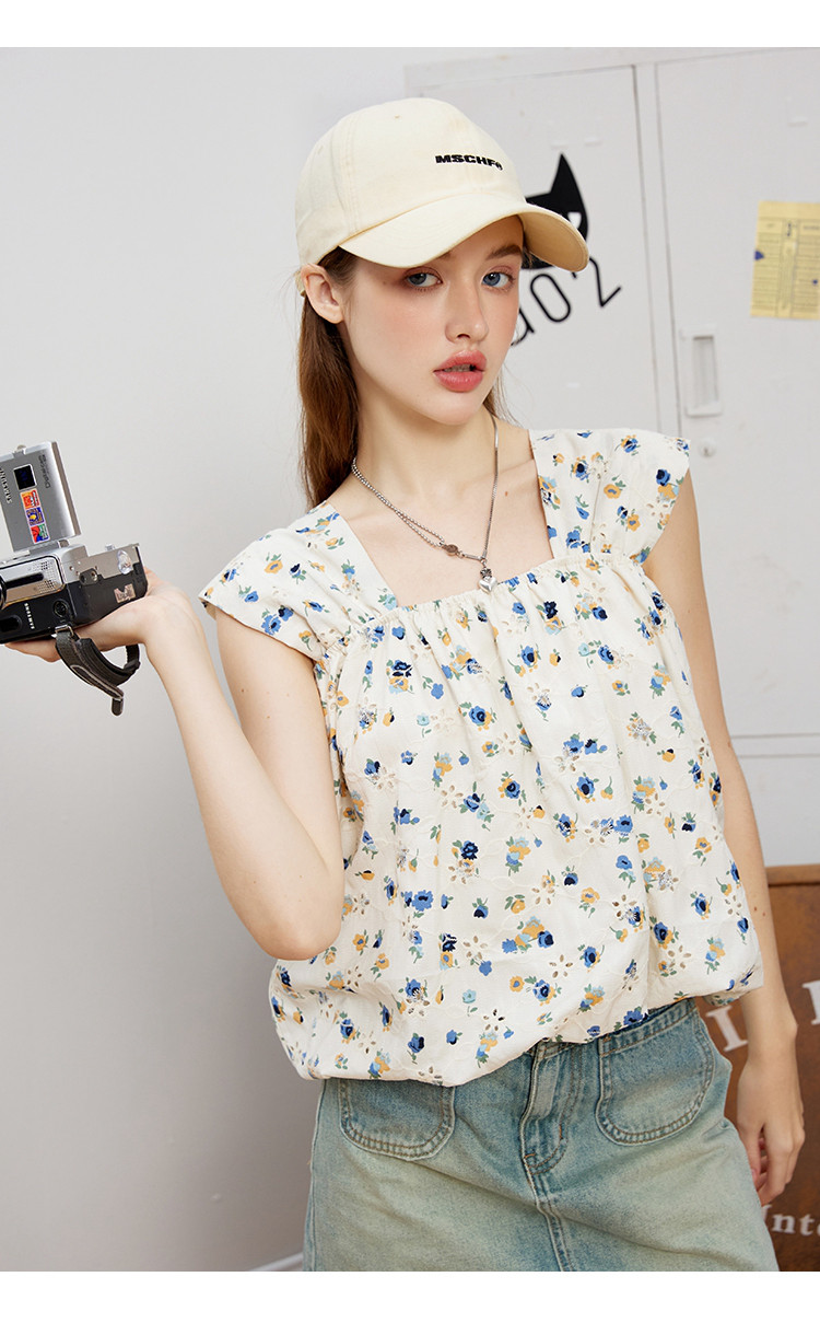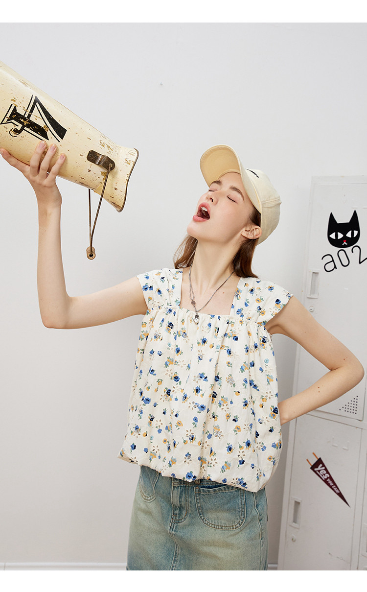 无袖方领碎花吊带宽松显瘦女式衬衫夏季甜美短款上衣 910749