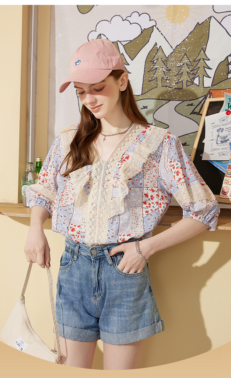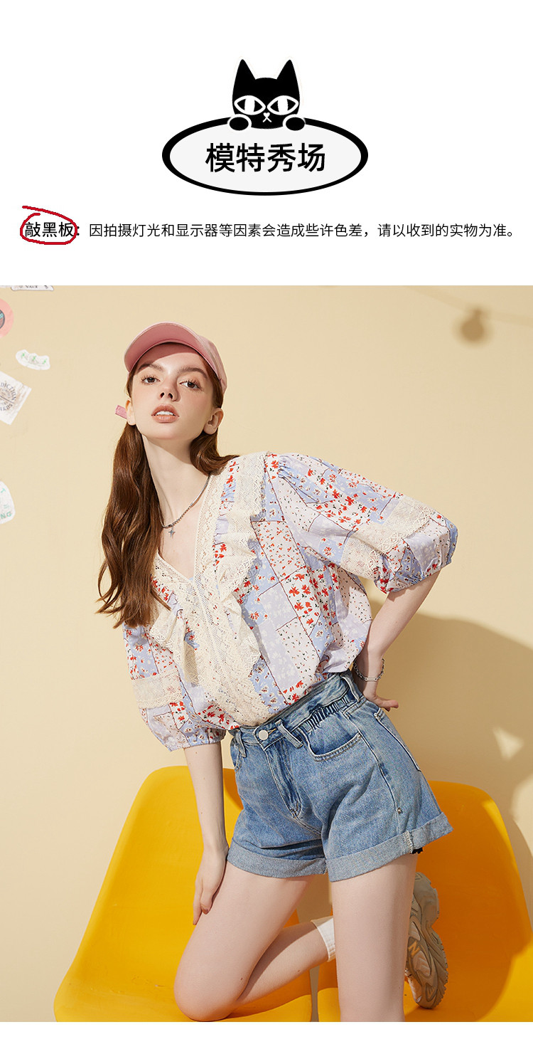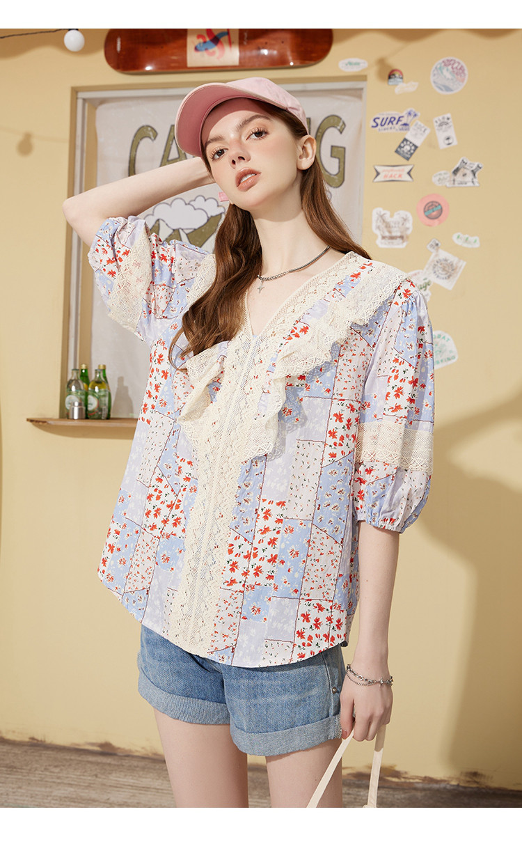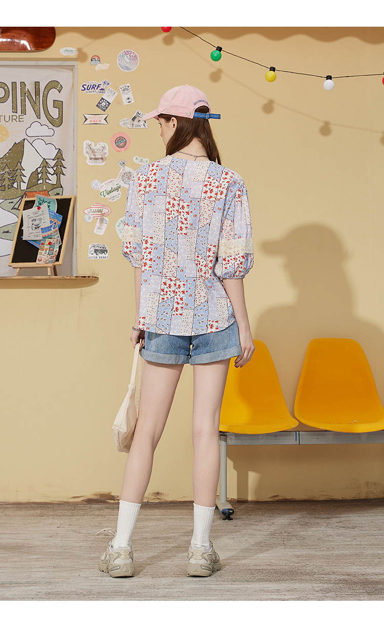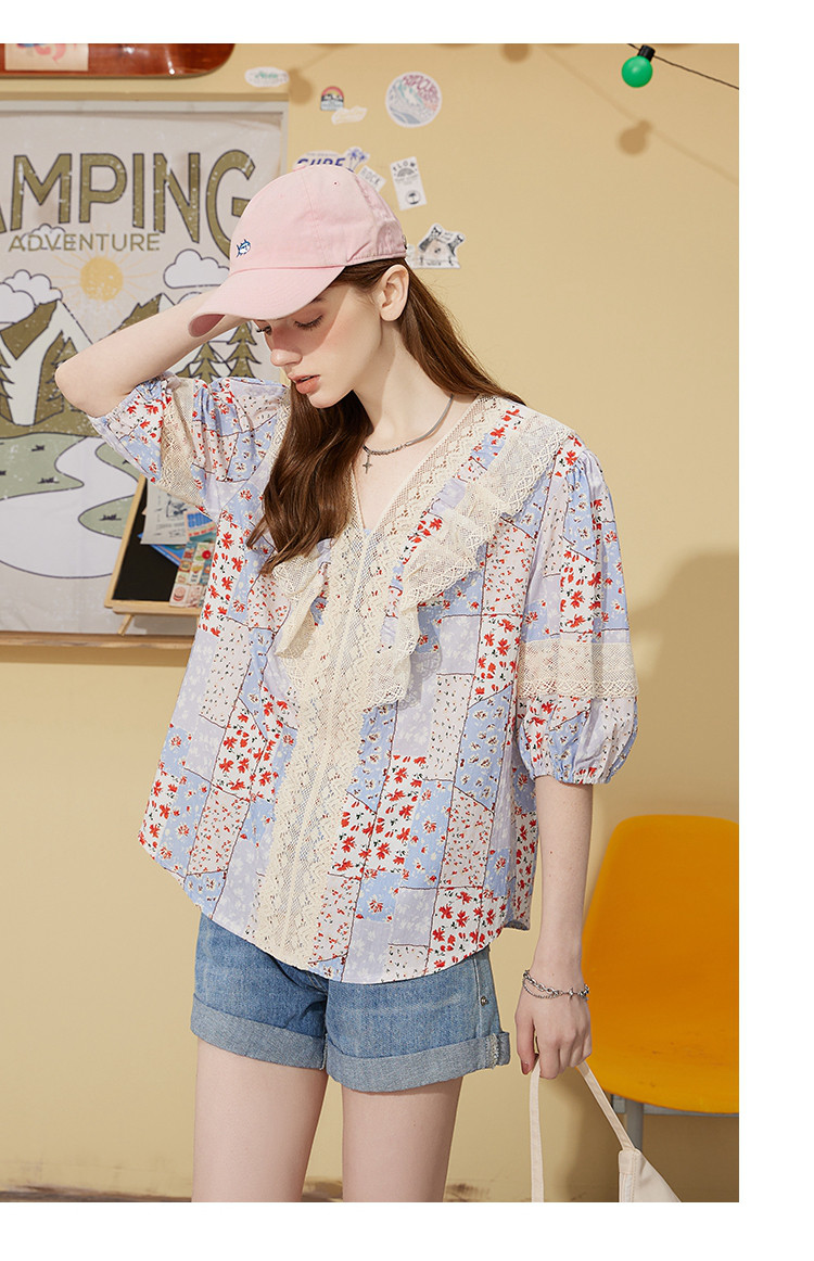 商品名称:甜美蕾丝碎花设计半袖上衣夏季新宽松休闲个性女式衬衫 191133
