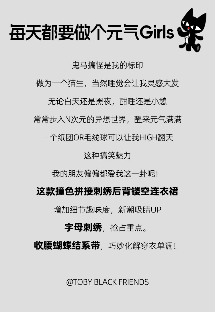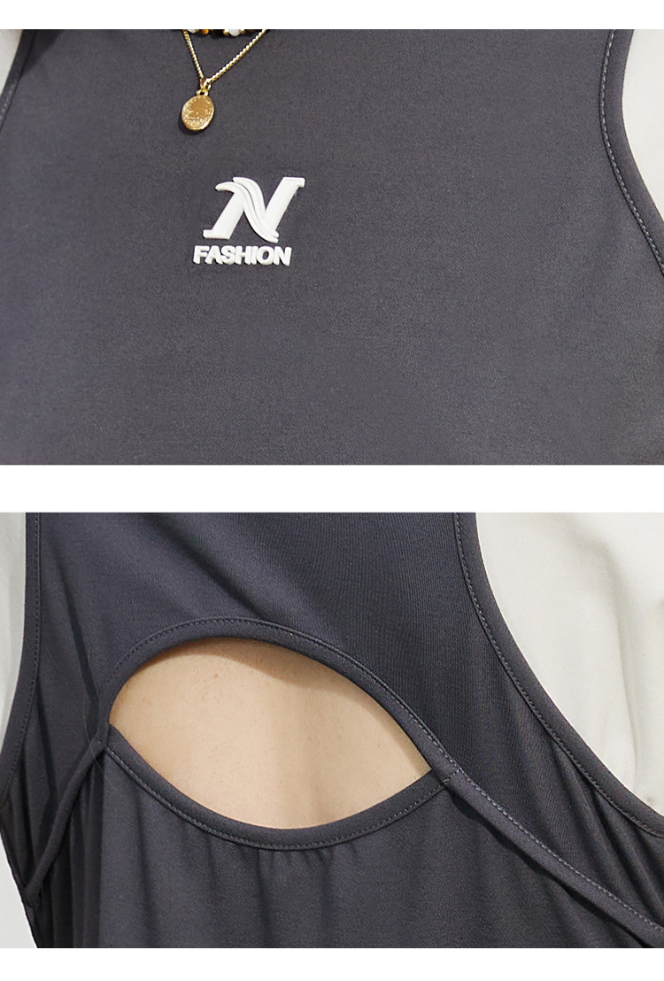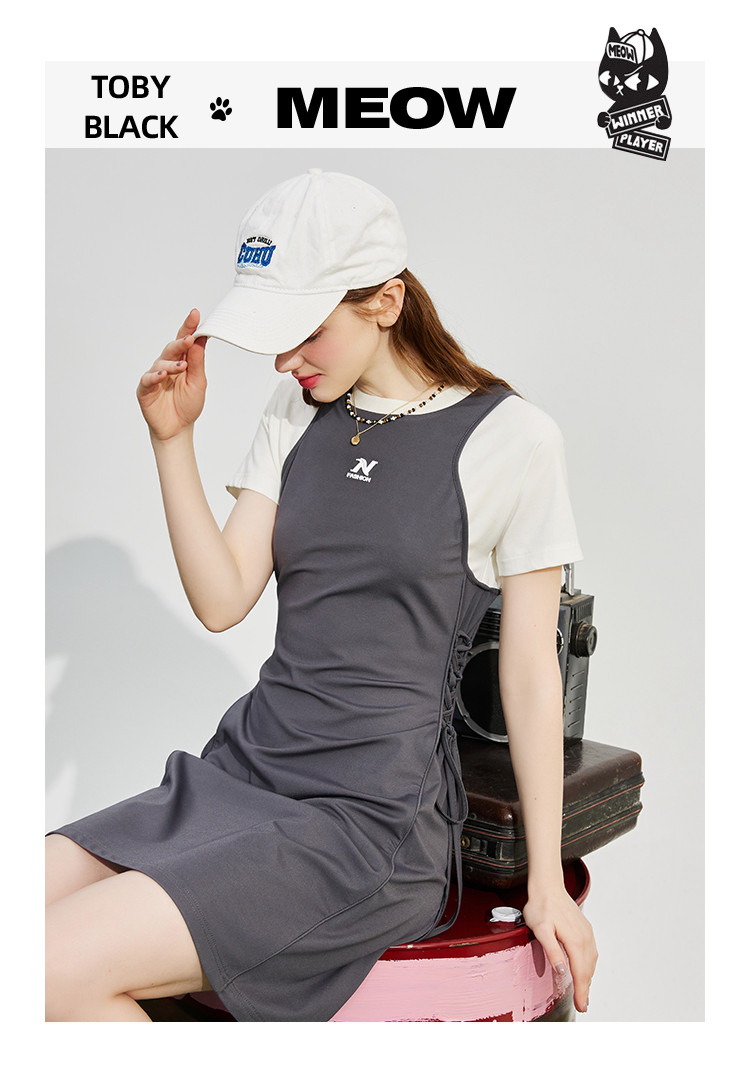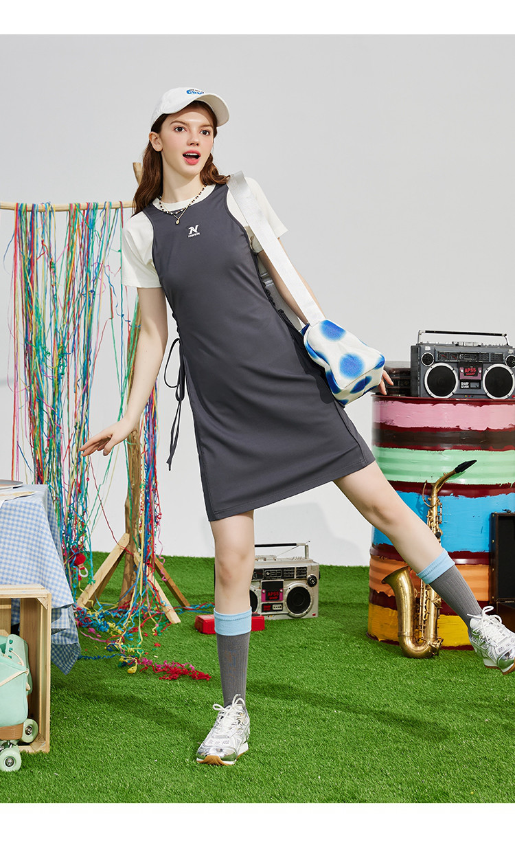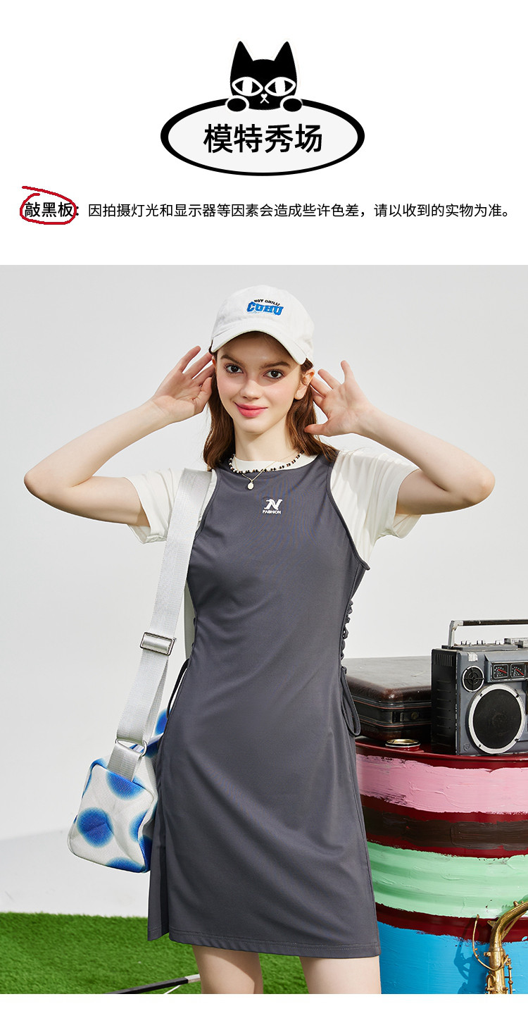 个性撞色拼接系带领设计感微开叉连衣裙夏季收腰A字裙 867421