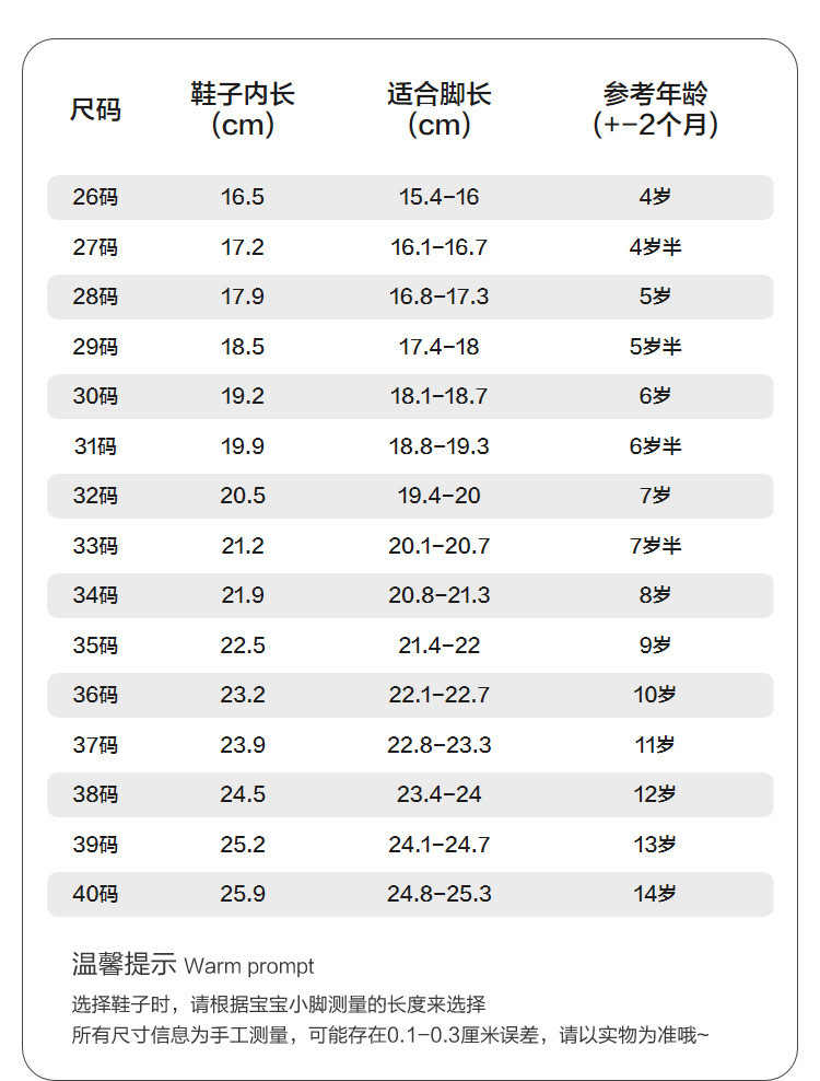 尺码 欧洲码 脚长(mm) 鞋内长(mm)