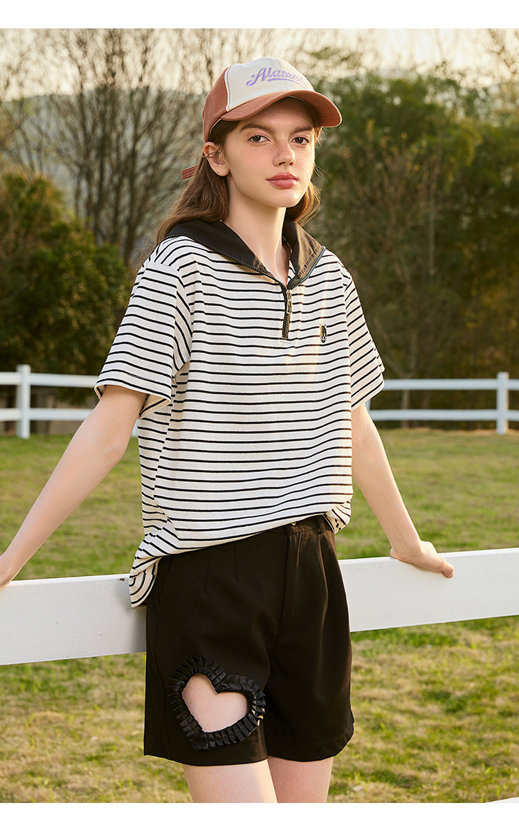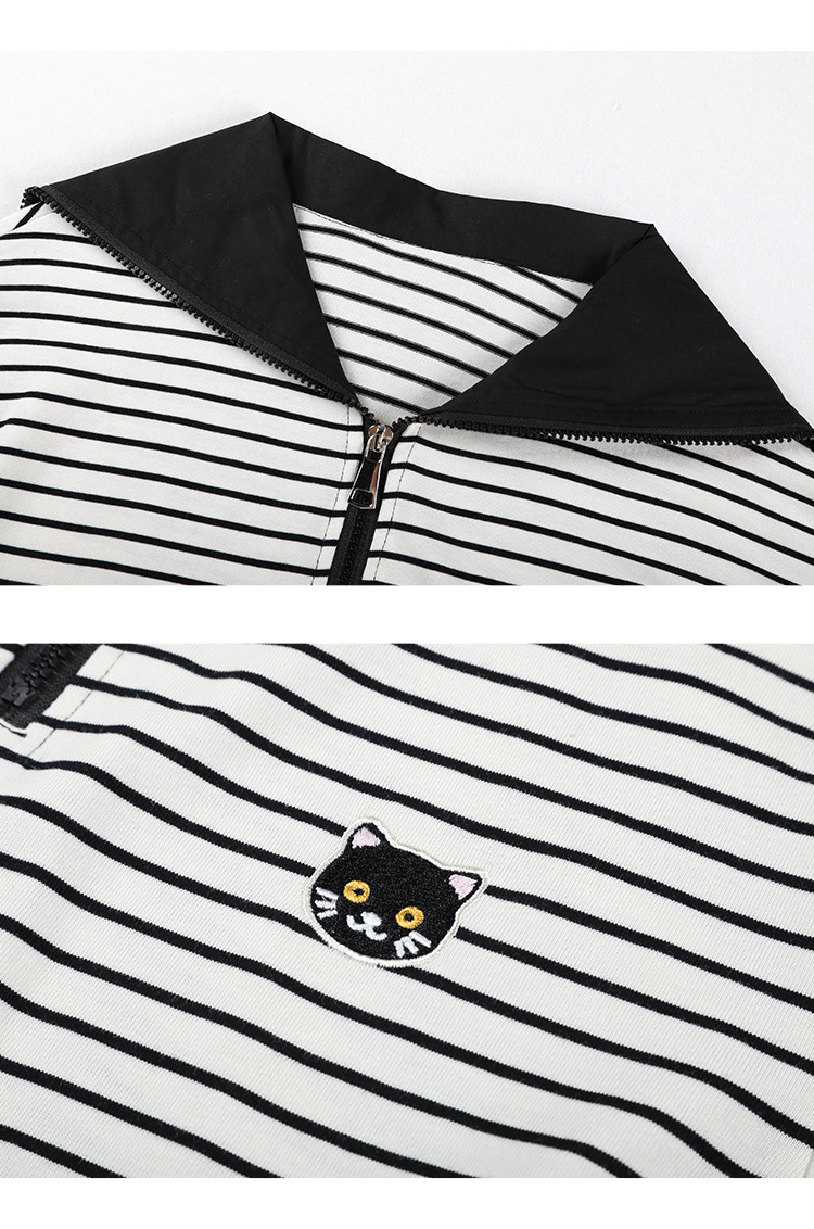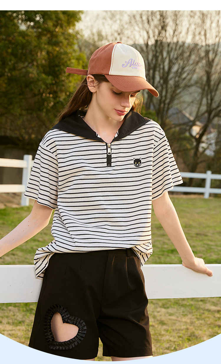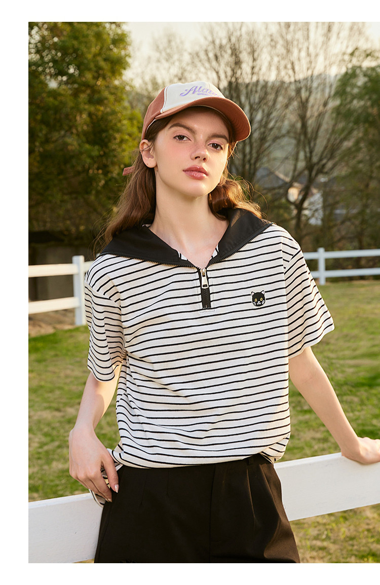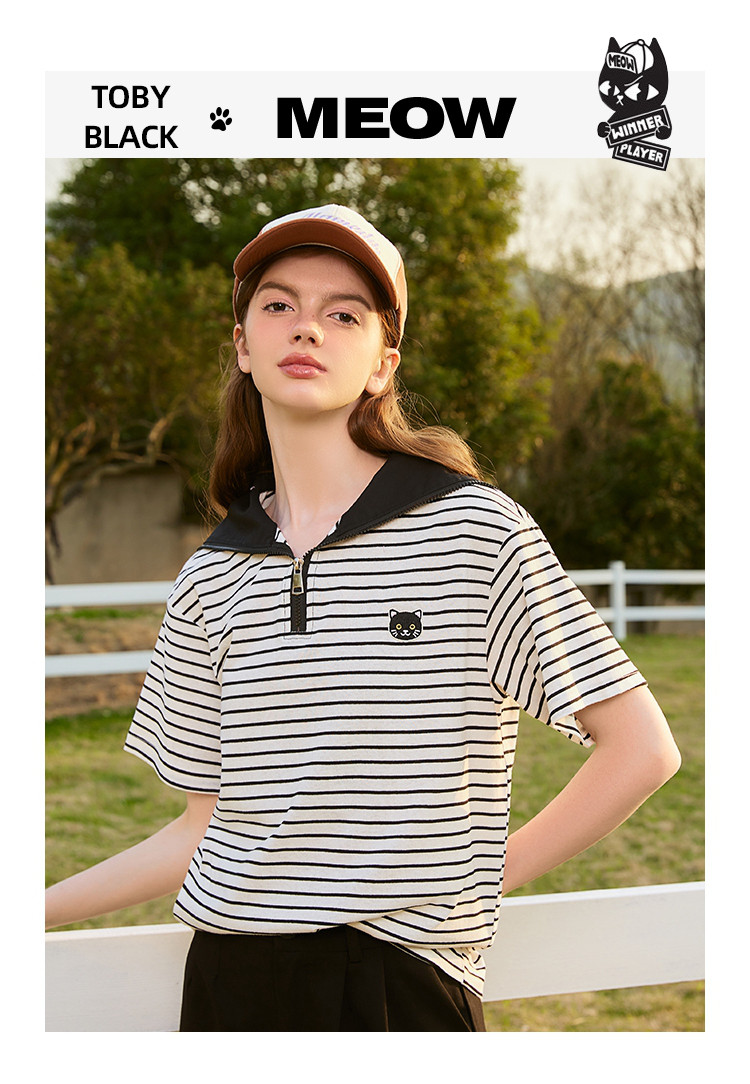 撞色拼接条纹设计短袖上衣夏季猫头刺绣休闲百搭女式T恤 303965