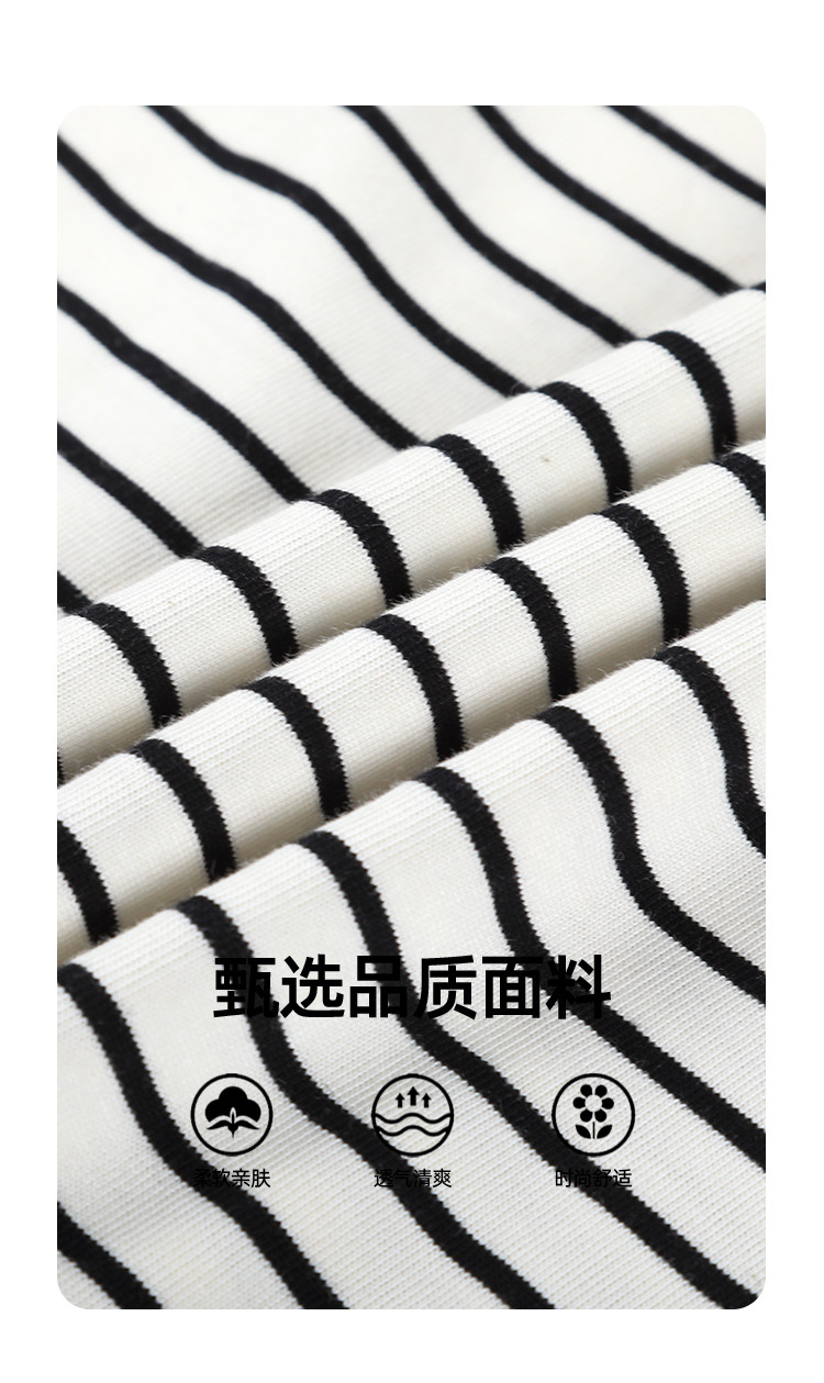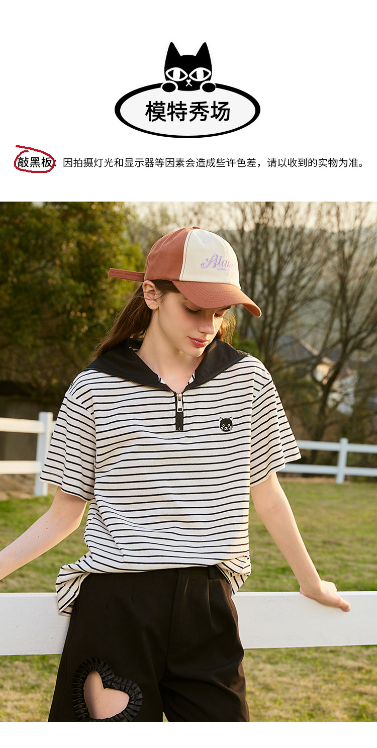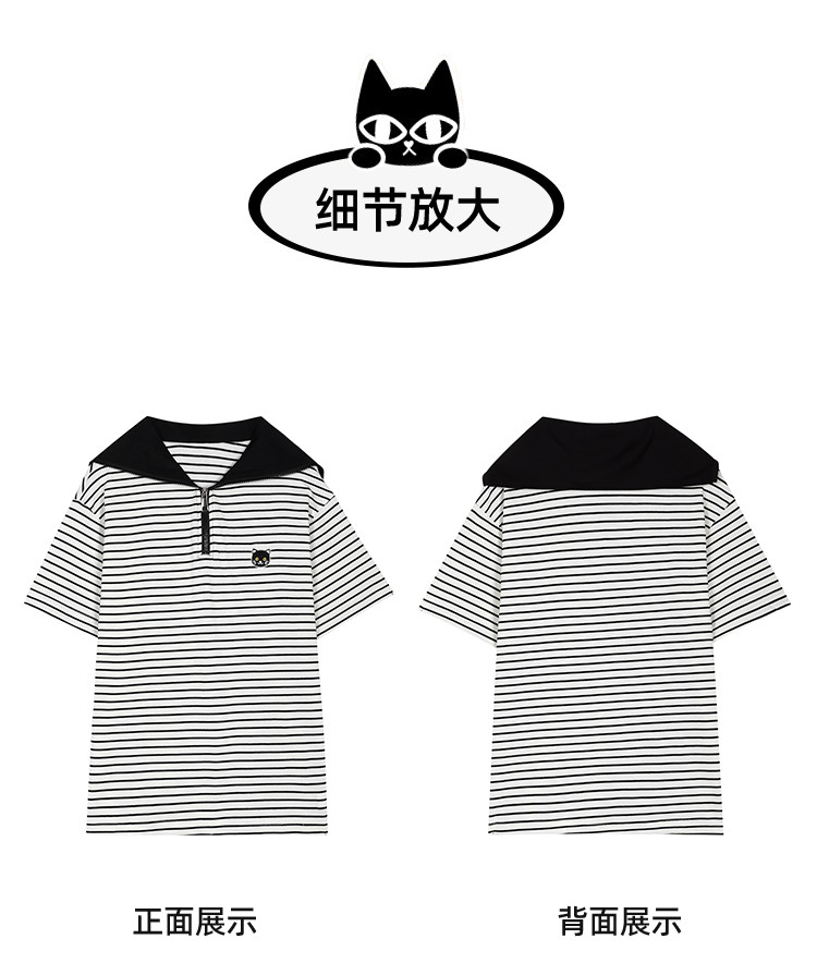 商品名称:撞色拼接条纹设计短袖上衣夏季猫头刺绣休闲百搭女式T恤 303965