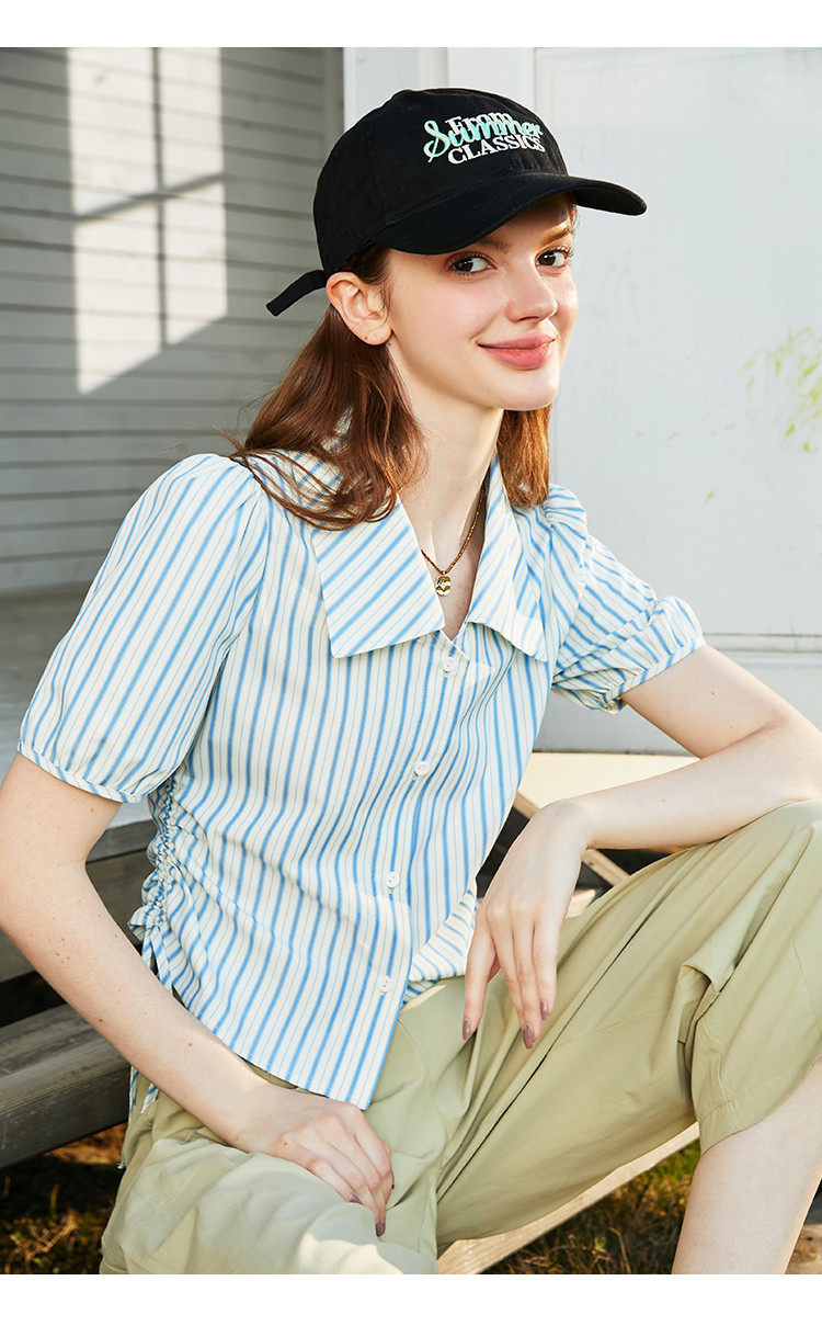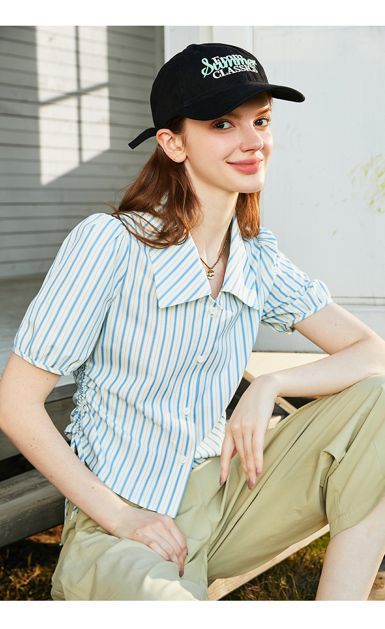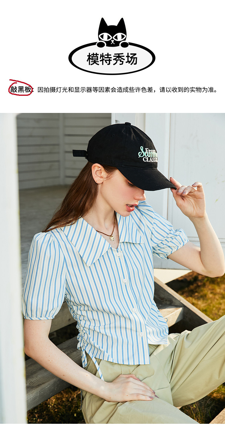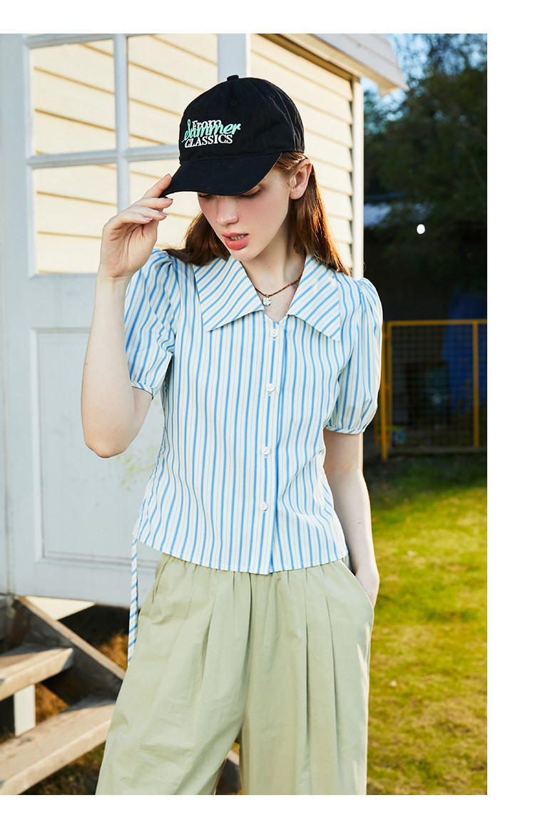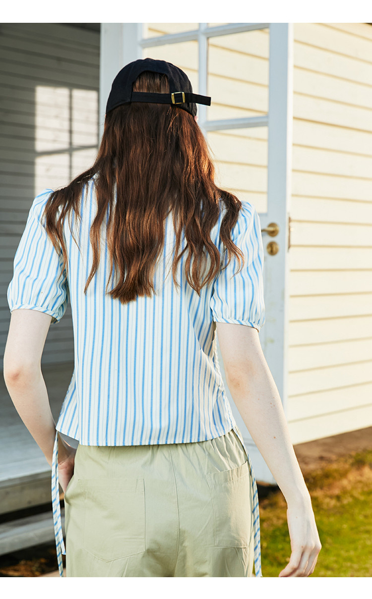商品名称:修身抽绳设计感条纹女式衬衫夏季泡泡袖小清新上衣 531485