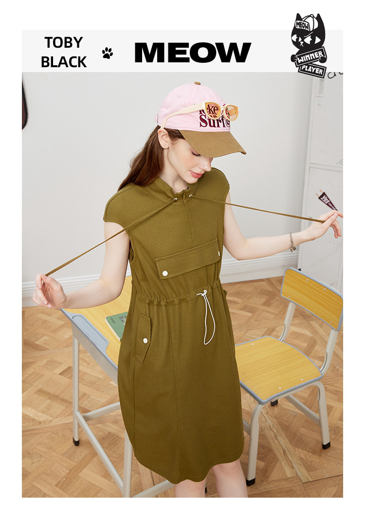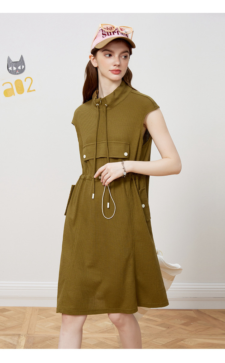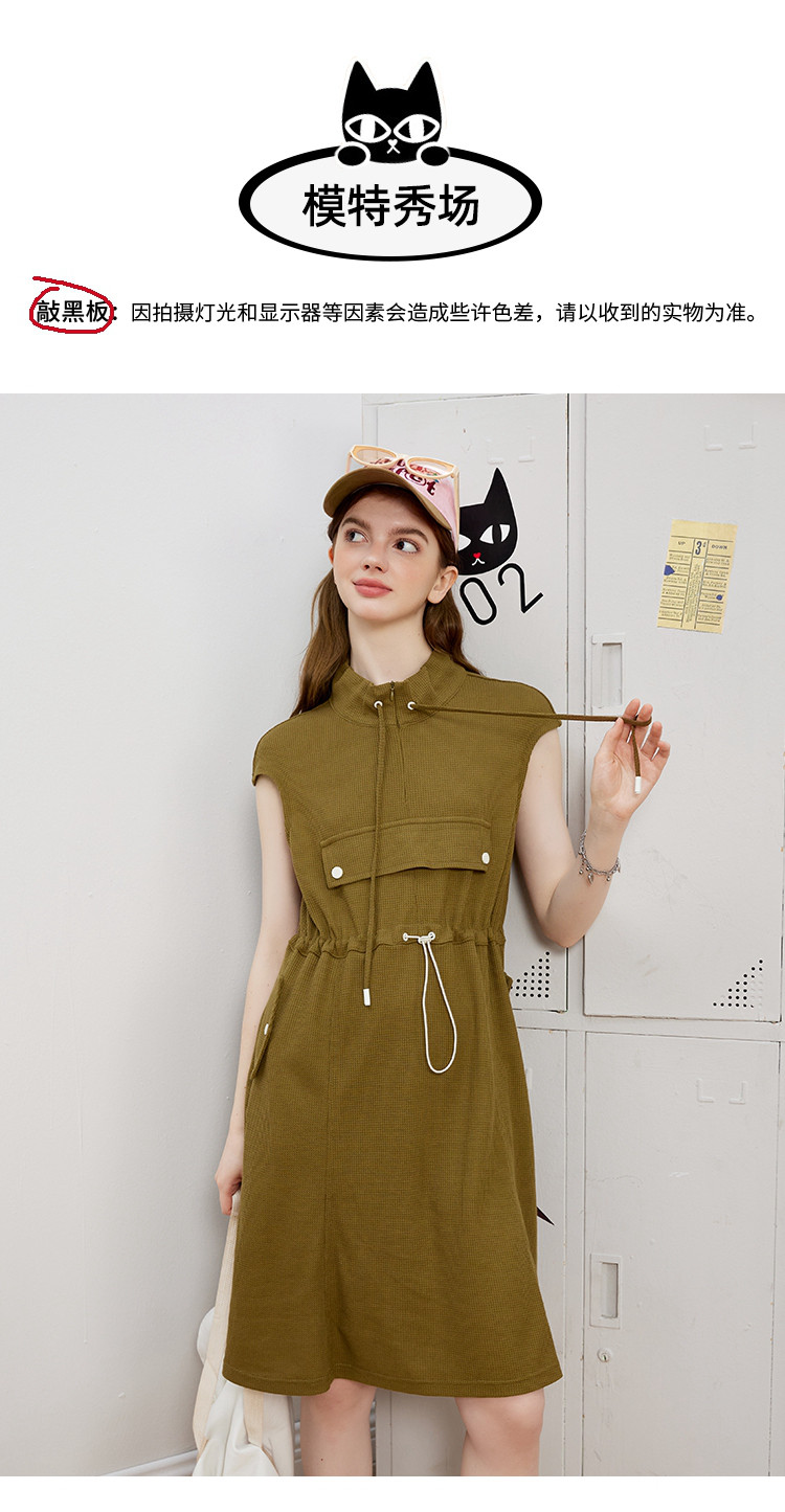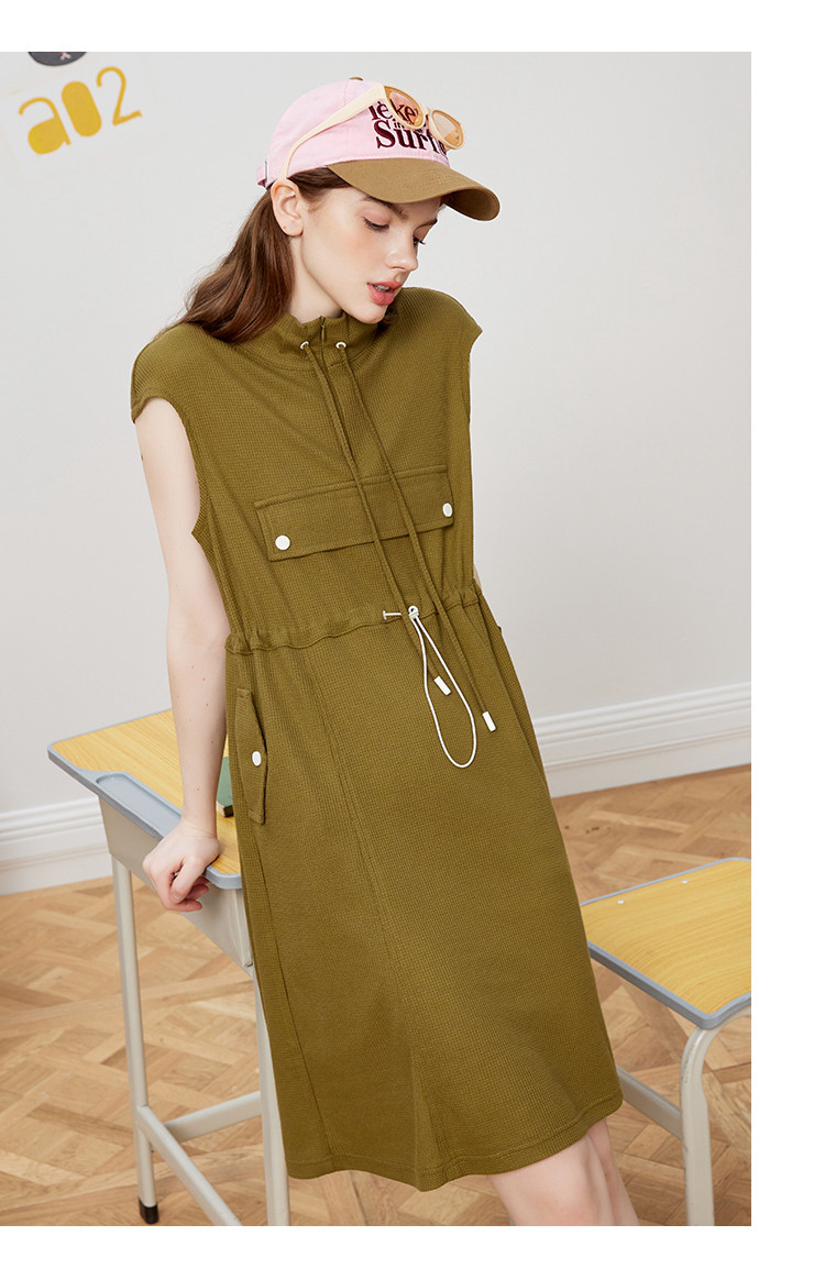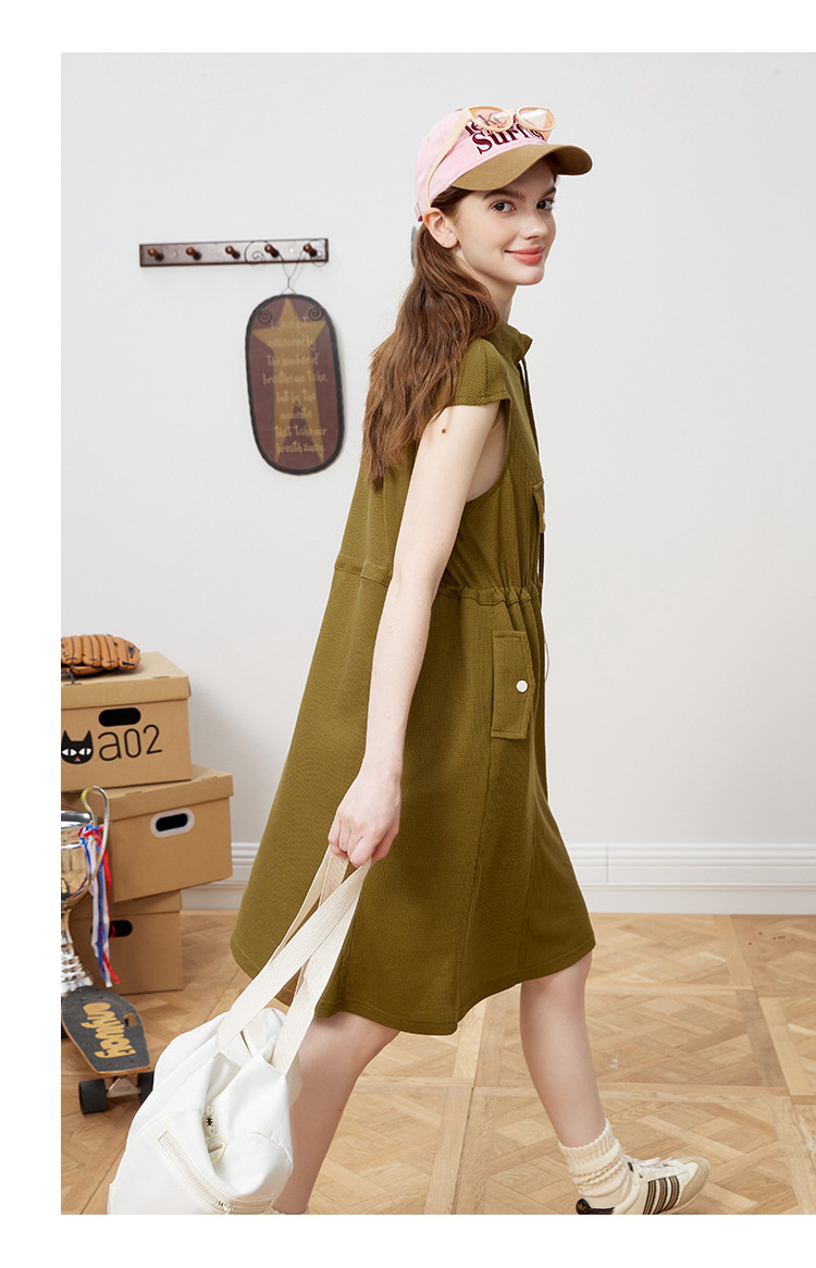 休闲运动风抽绳收腰设计连衣裙夏季翻领拉链短袖A字裙 453021