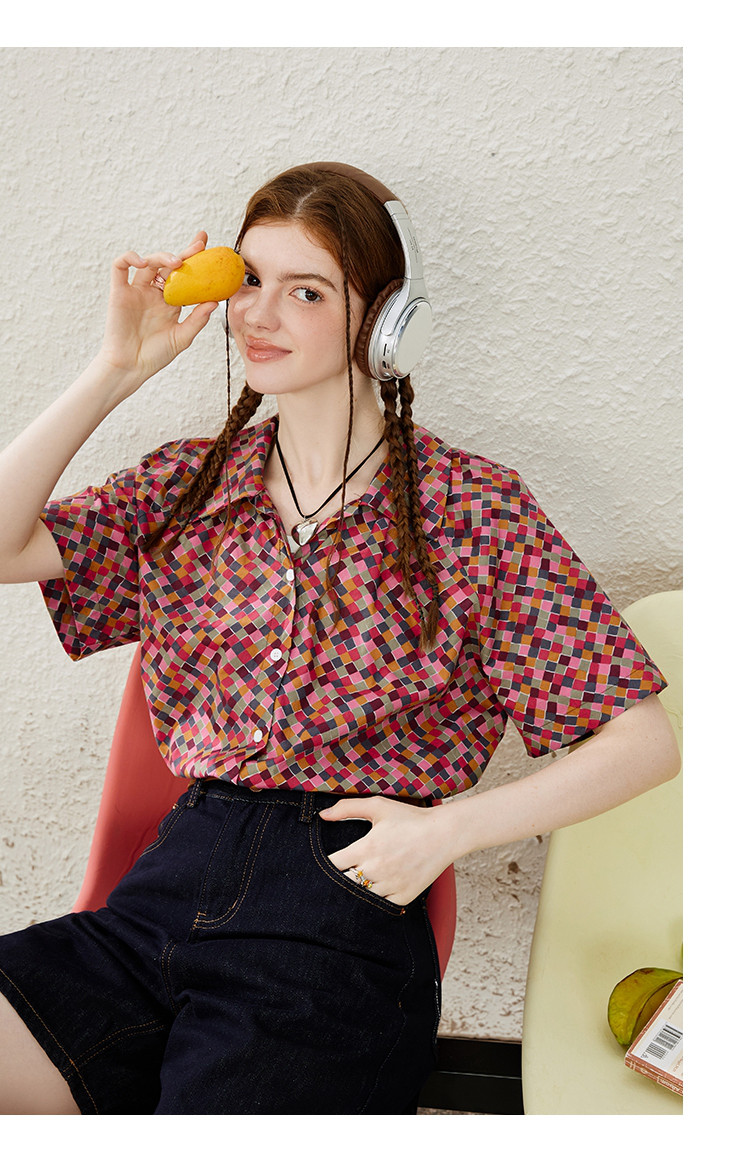 【100%棉】碎花洋气时髦女式衬衫夏季格纹短袖上衣 342237