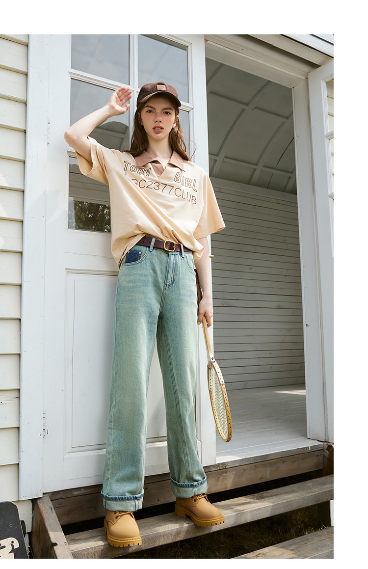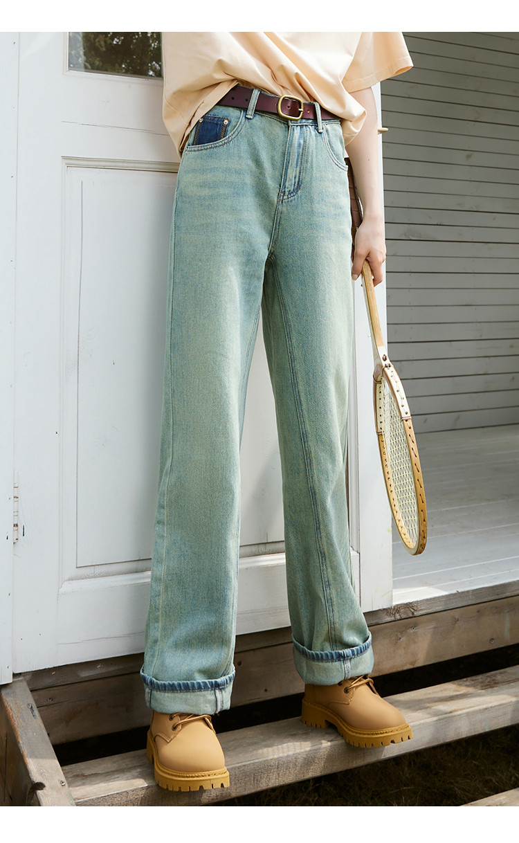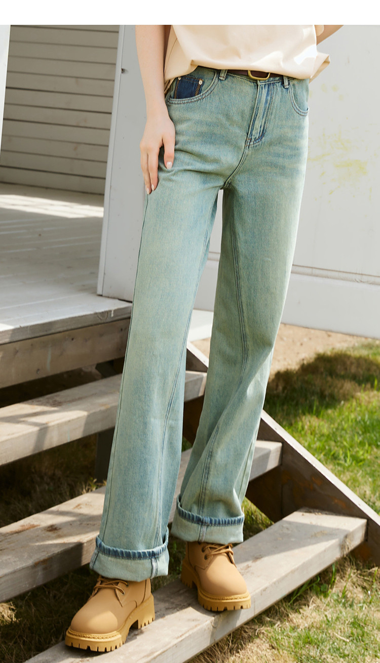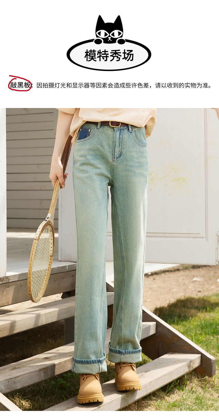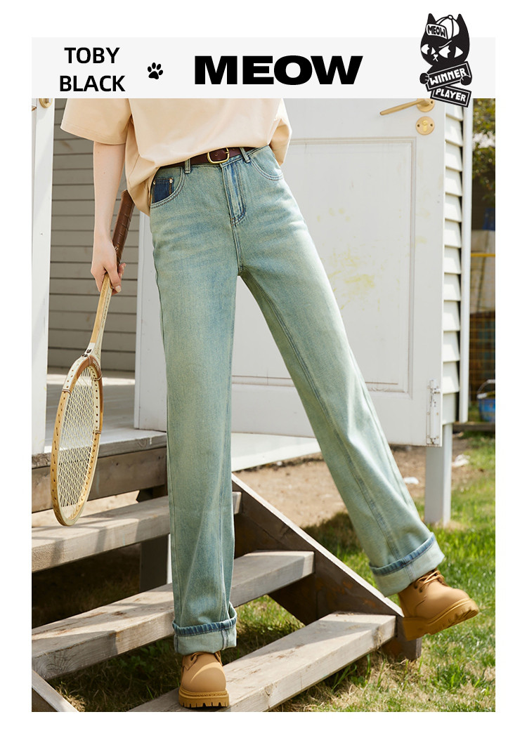 浅色经典款水洗做旧高腰直筒裤夏季休闲百搭女式牛仔裤 083869