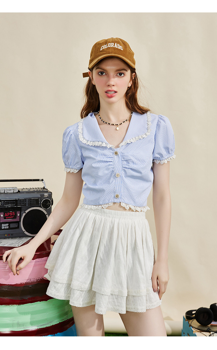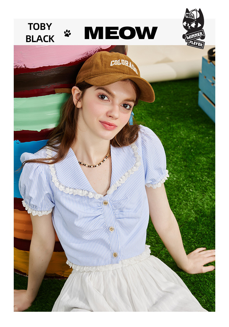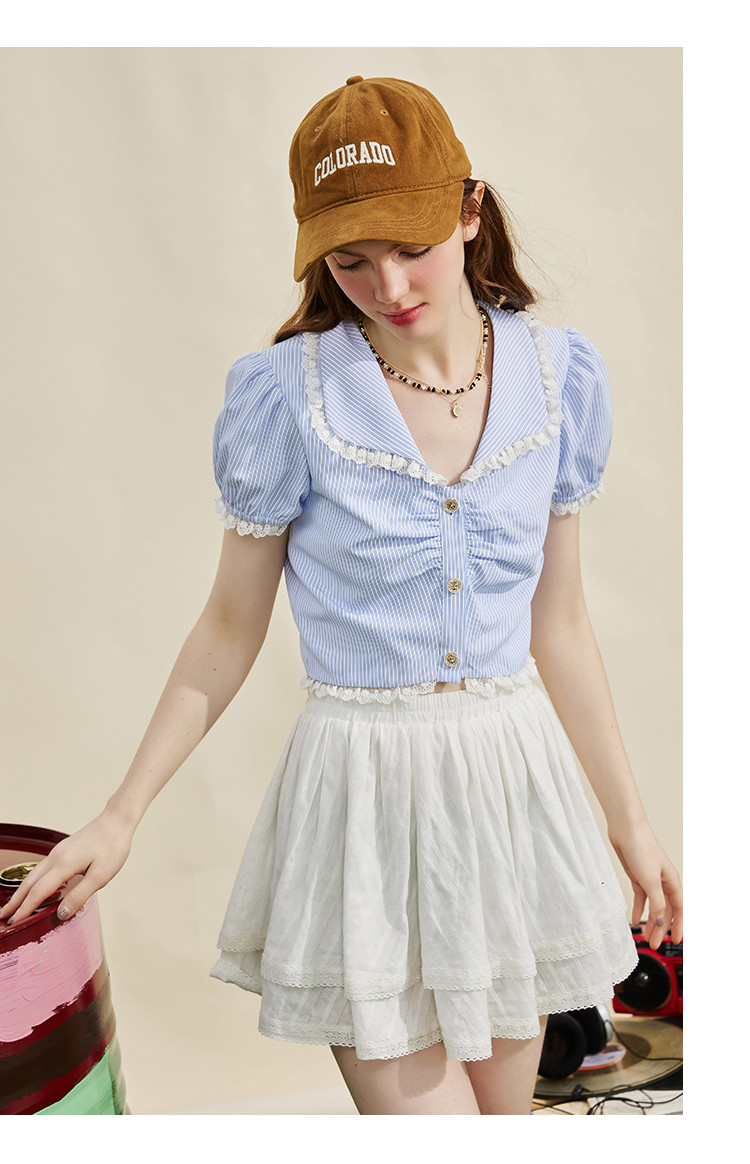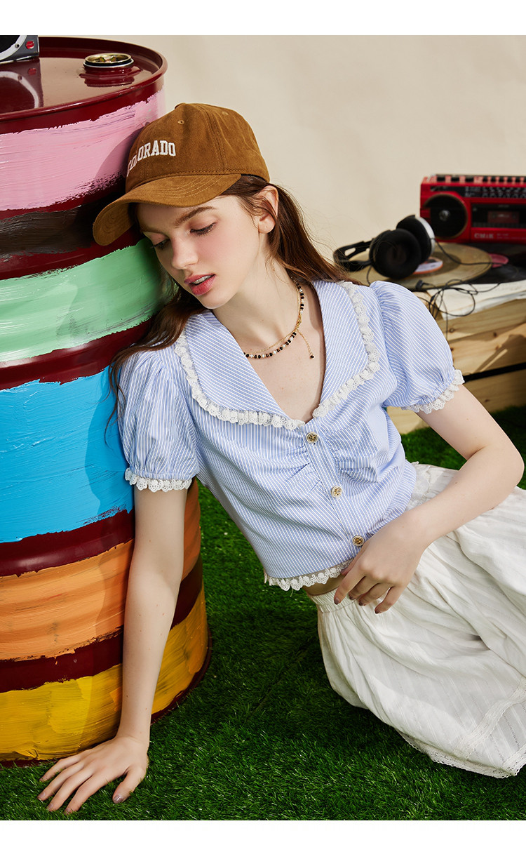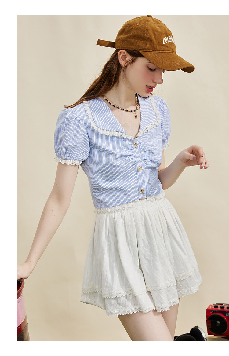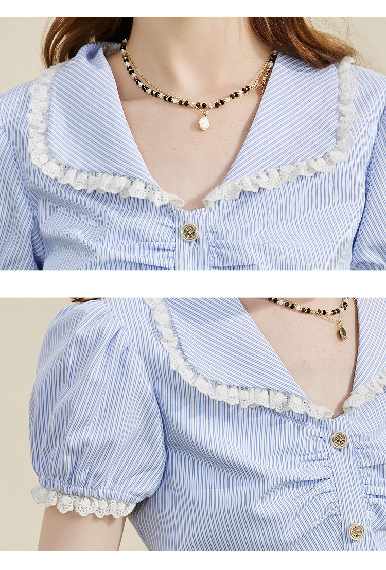 设计师法式假日娃娃领蕾丝边小个子女式衬衫夏季气质小衫 190365
