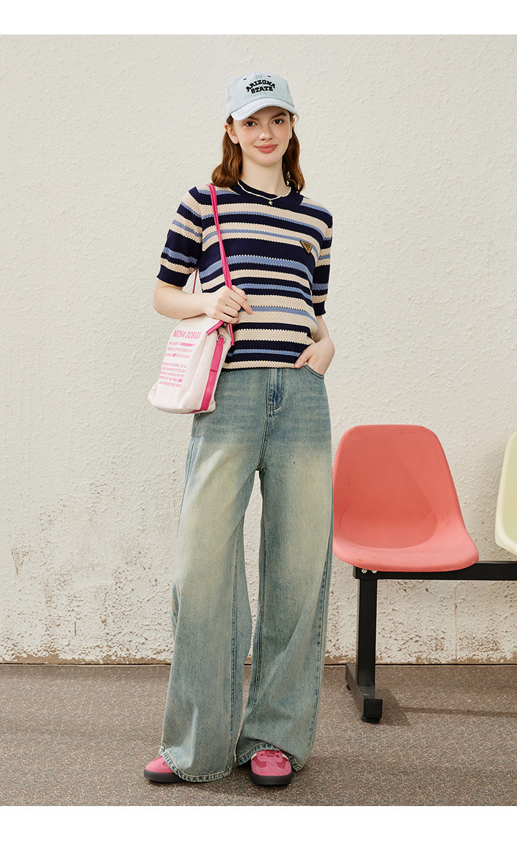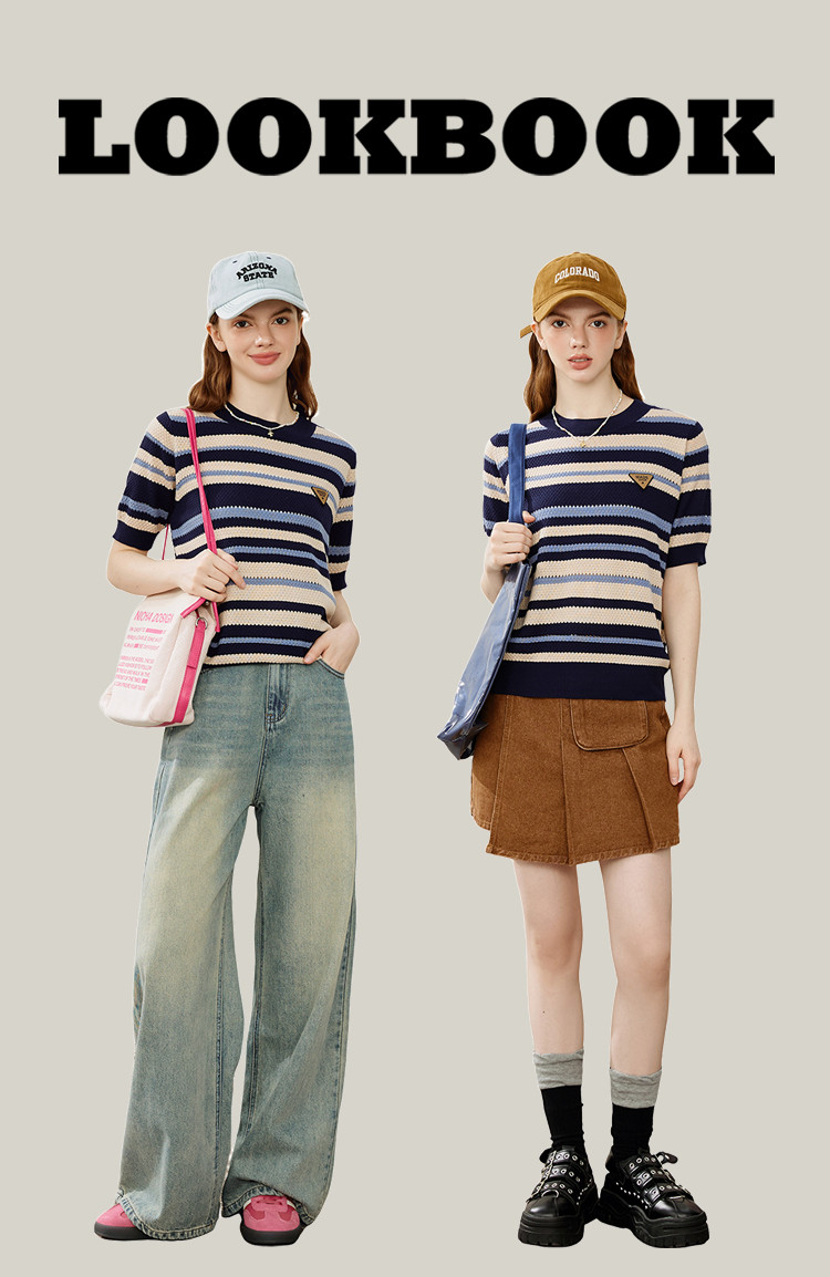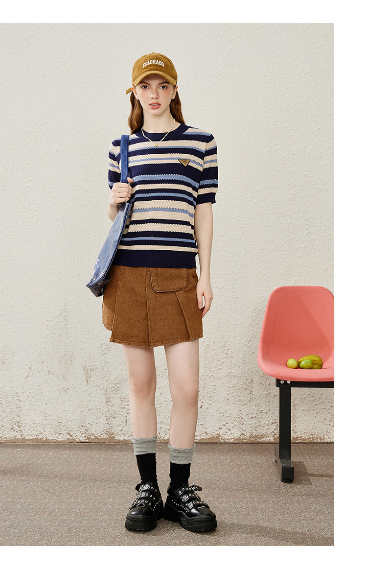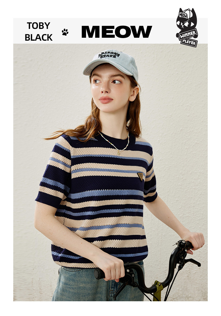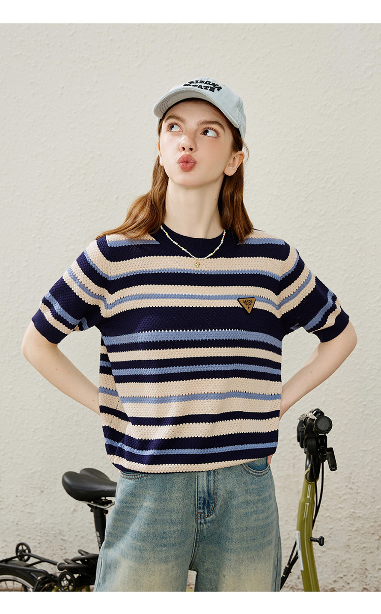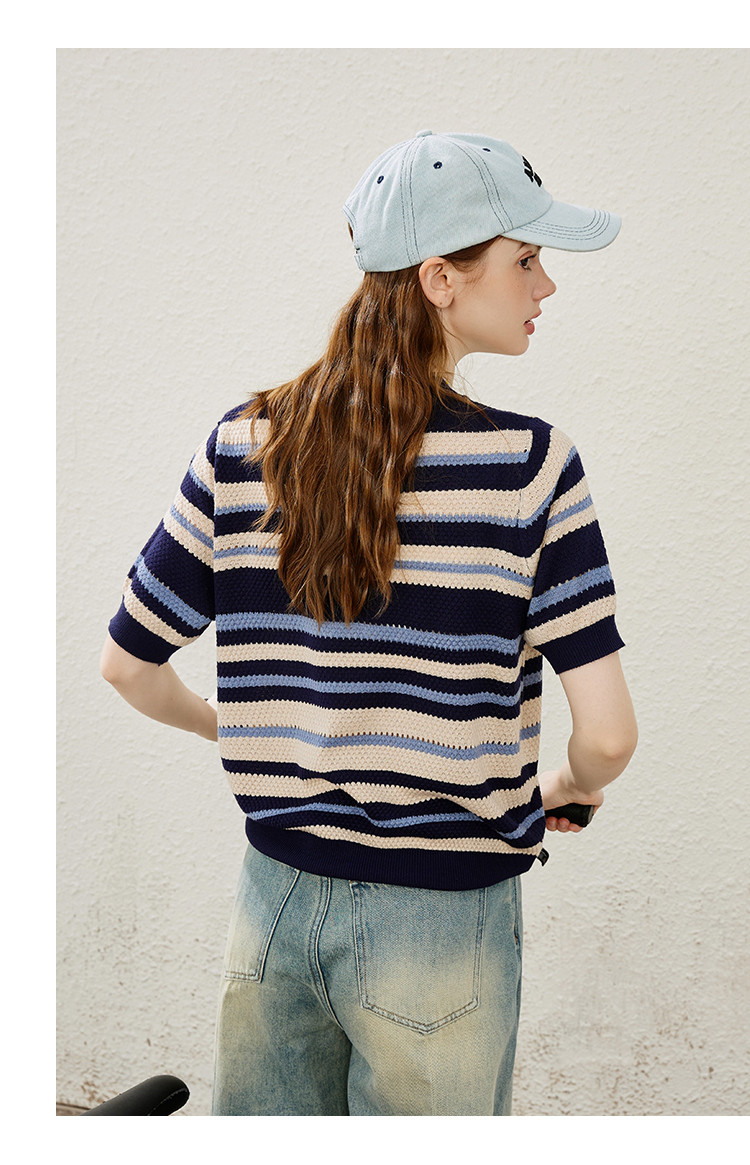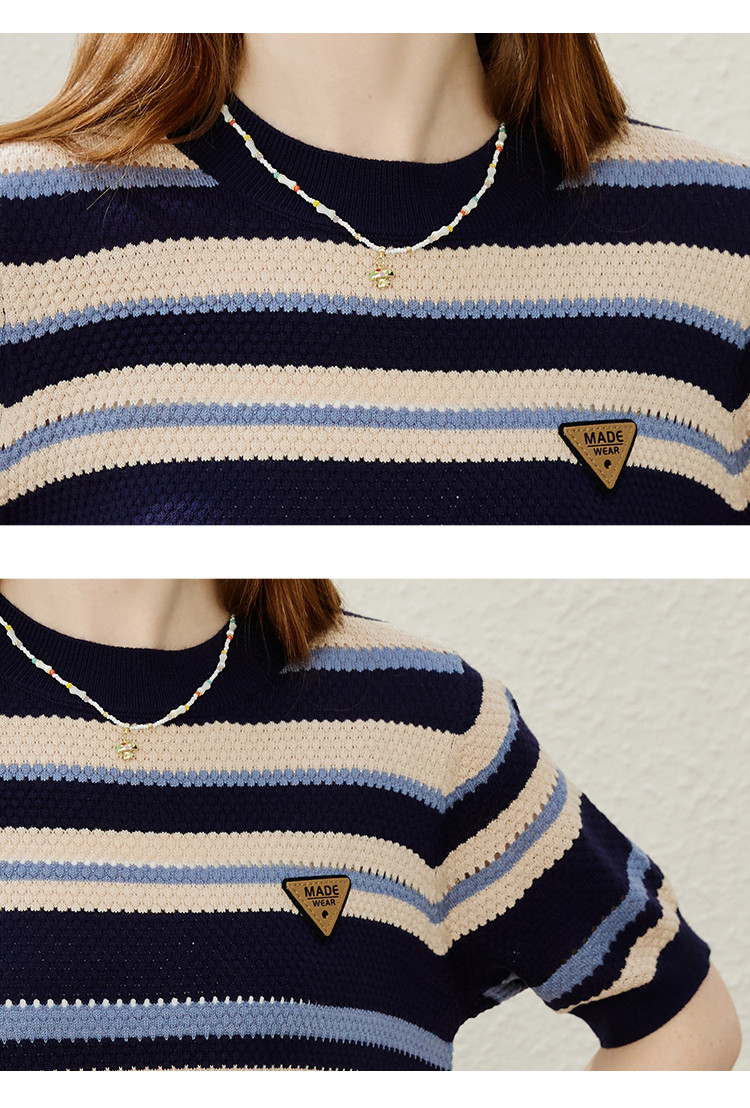 商品名称:休闲简约小清新百搭针织条纹上衣学院风女式针织衫 948061
