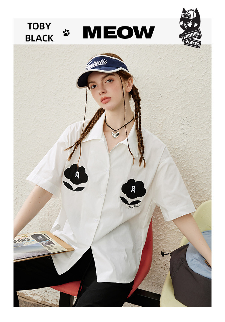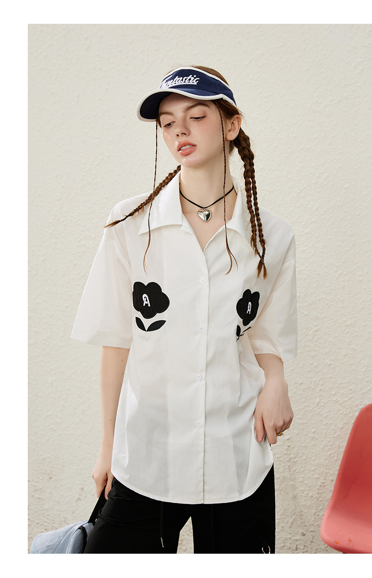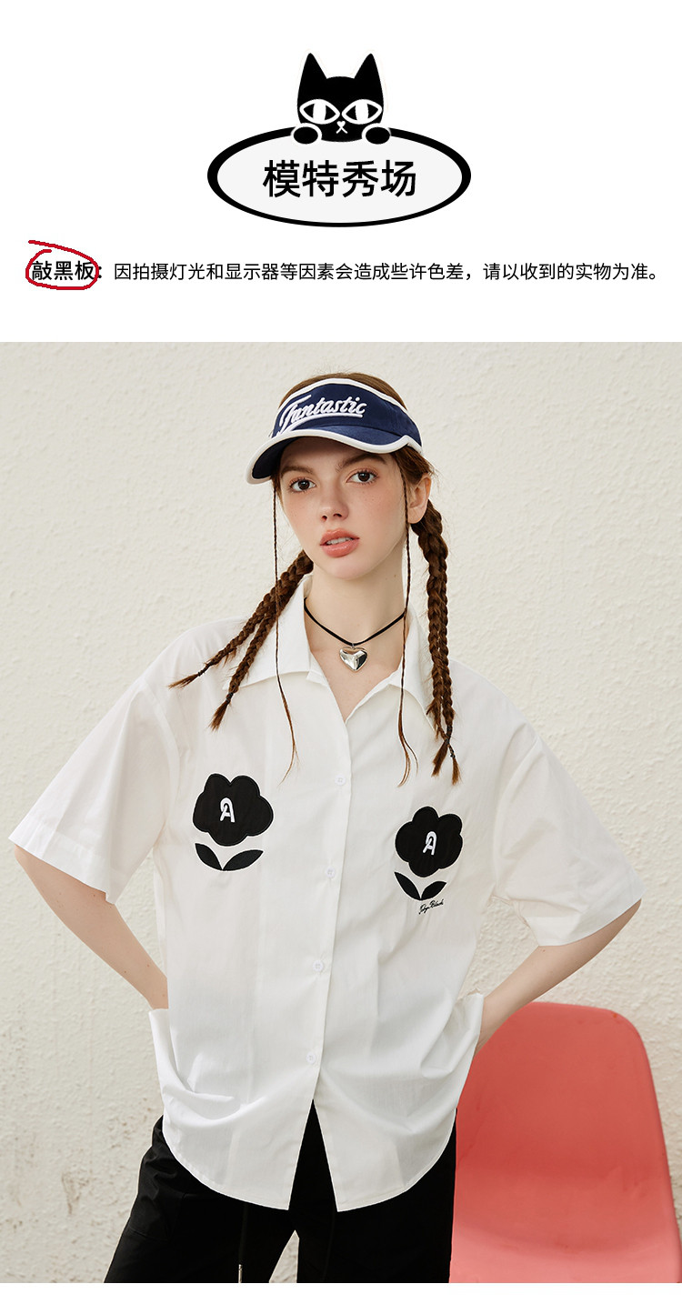 休闲干净简约印花设计短袖女式衬衫夏季百搭翻领上衣 521309