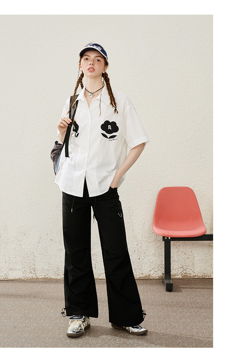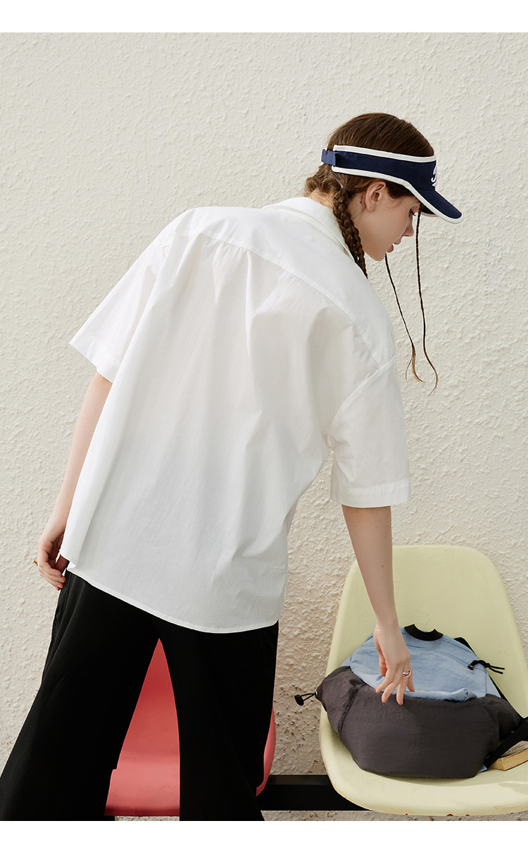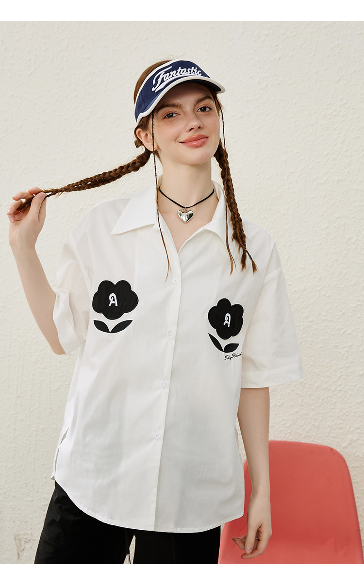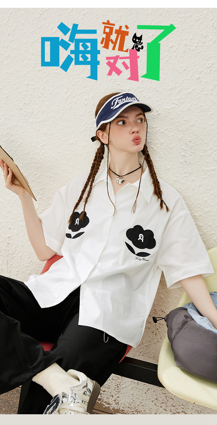 休闲干净简约印花设计短袖女式衬衫夏季百搭翻领上衣 521309