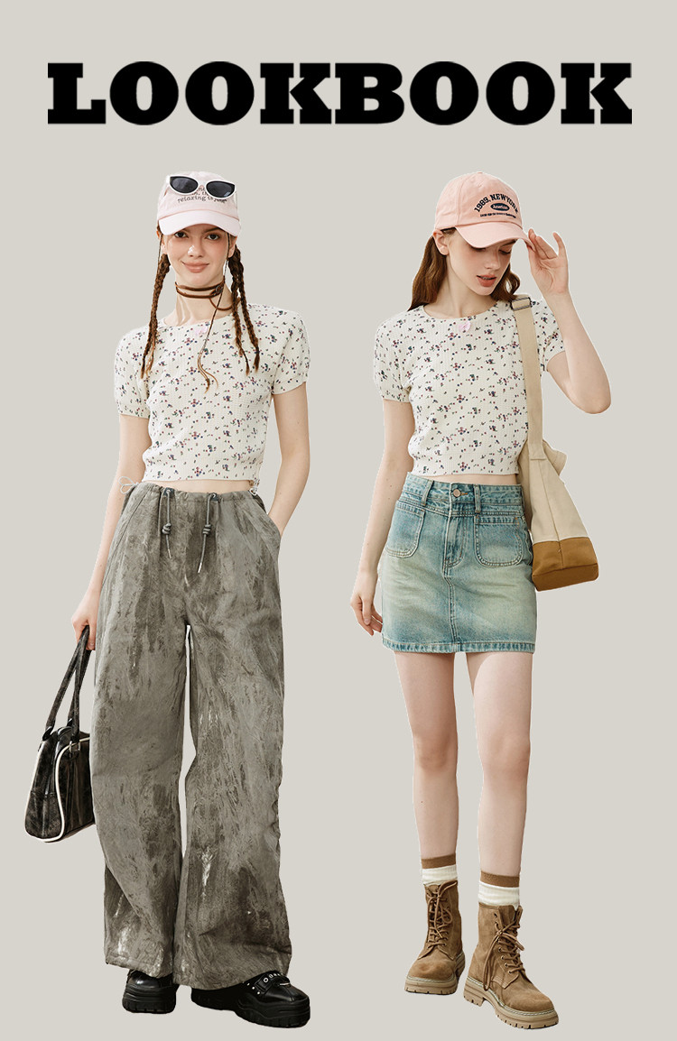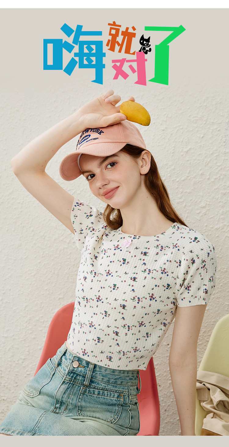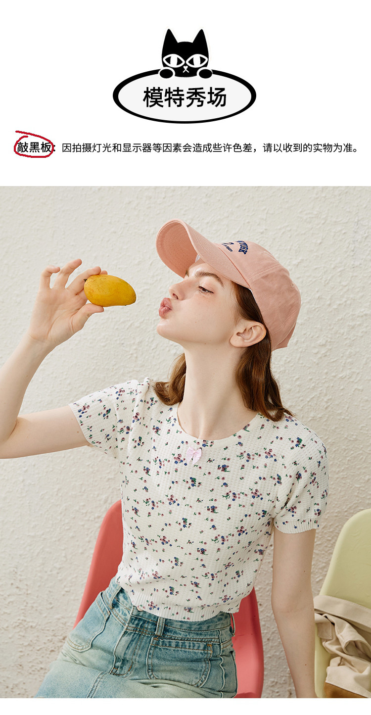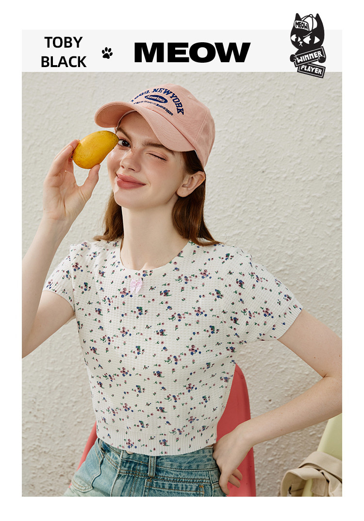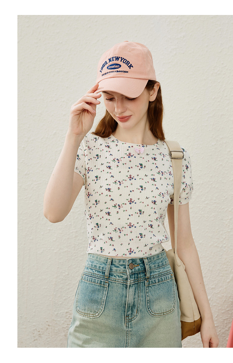 满印小花小清新设计修身小衫夏季休闲圆领短款女式针织衫 181533