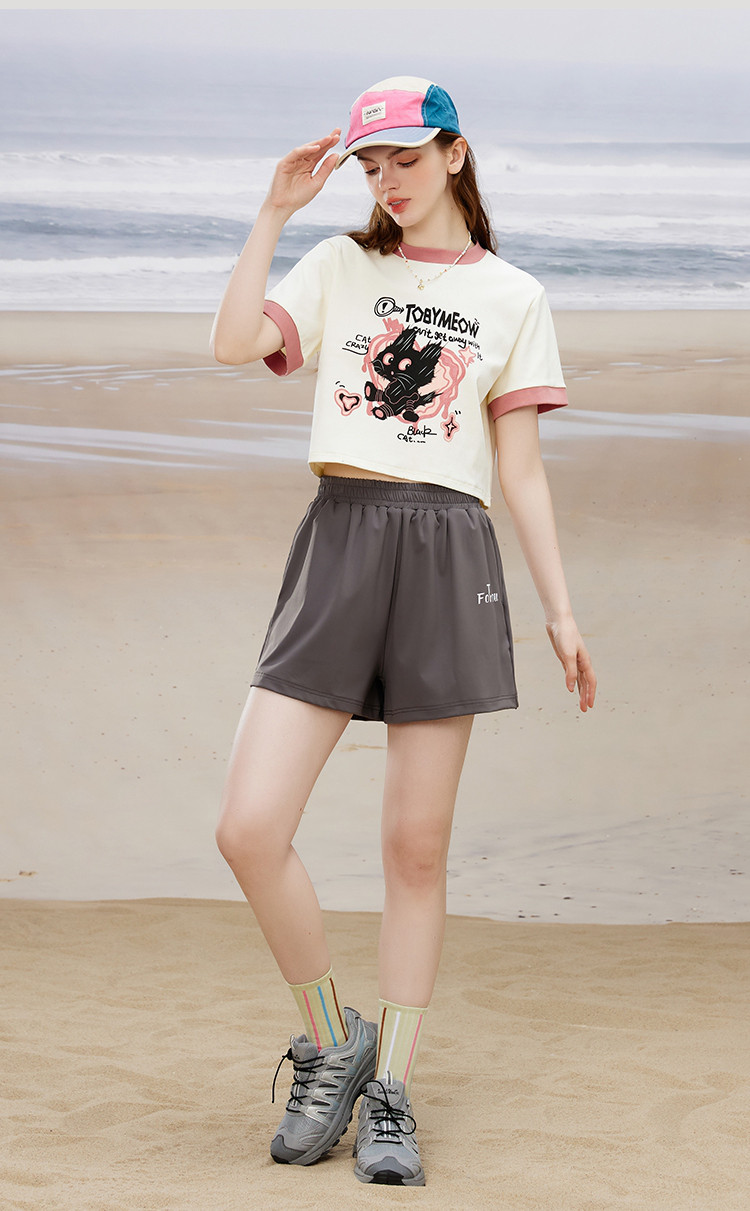 米子旗夏季纯色女式休闲裤腰部抽绳设计宽松显瘦阔腿裤薄款短裤 980186
