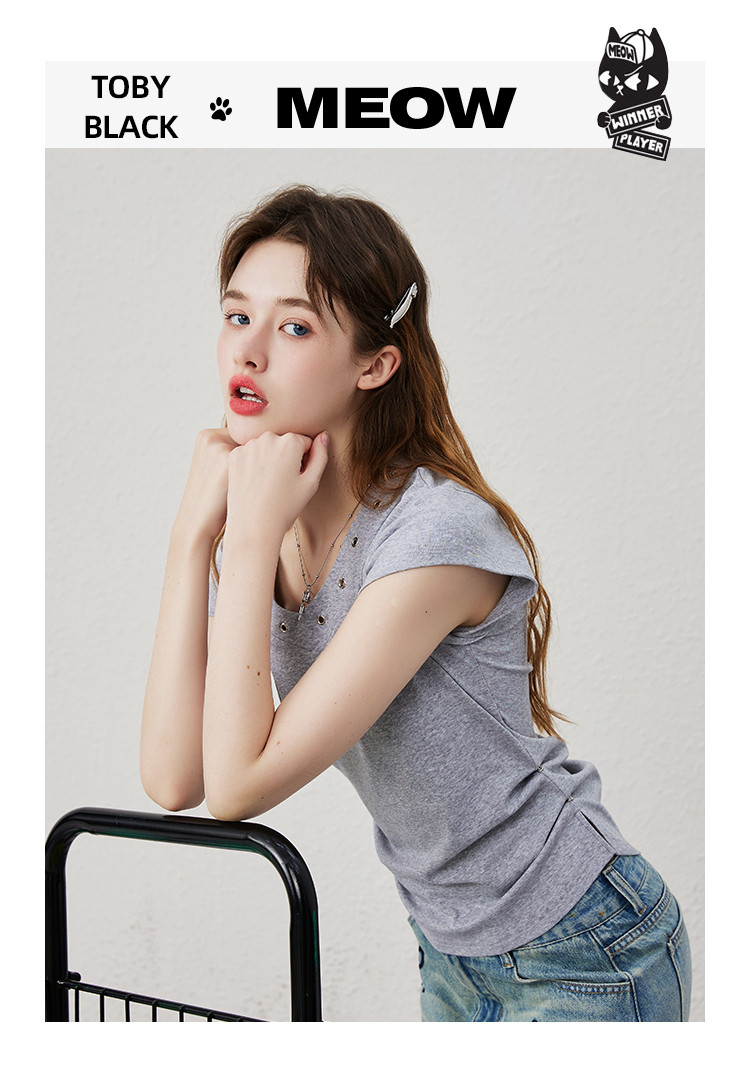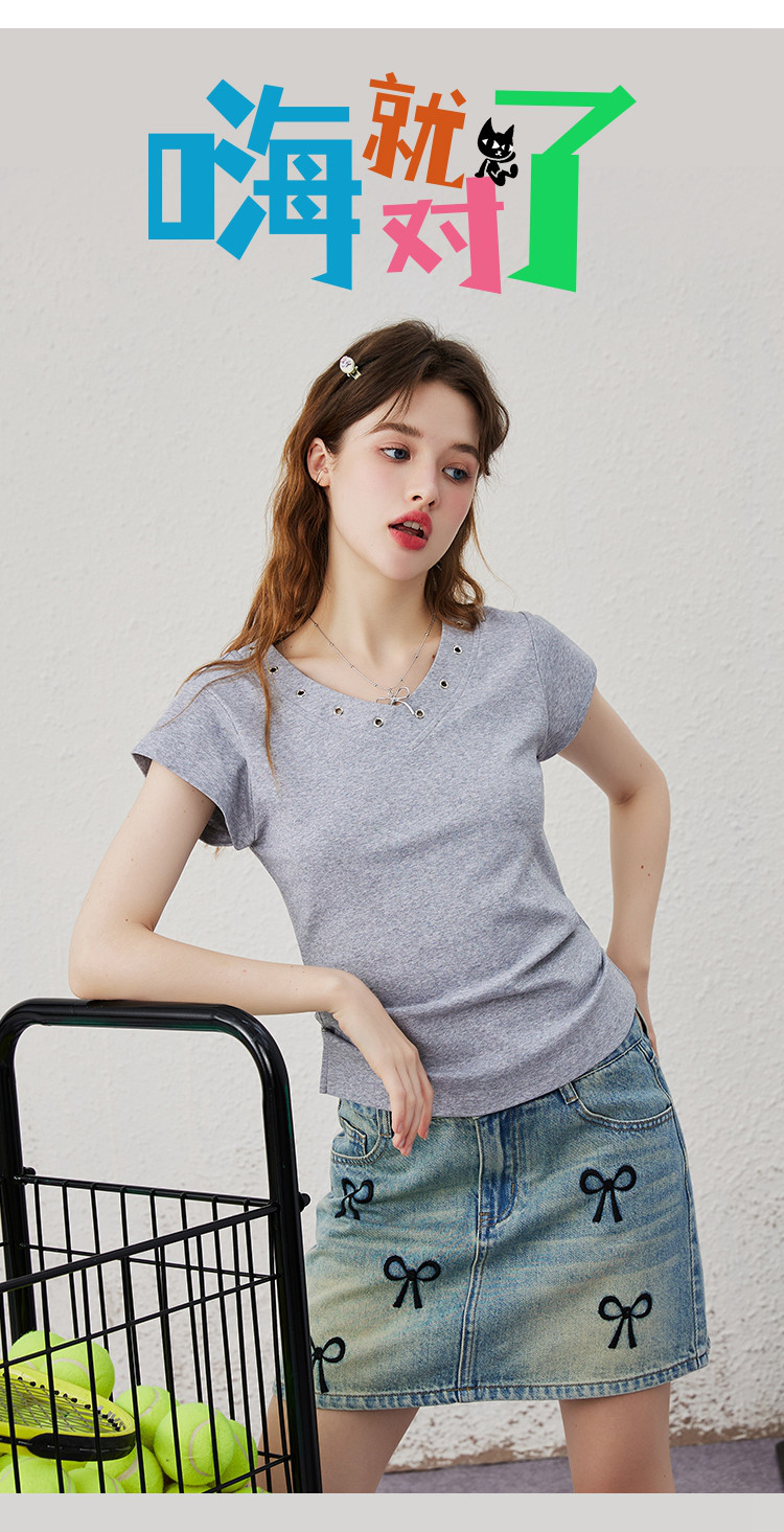 V领修身显瘦弹力辣妹女式T恤夏季个性褶皱设计感短袖 475805