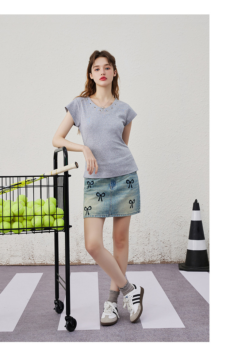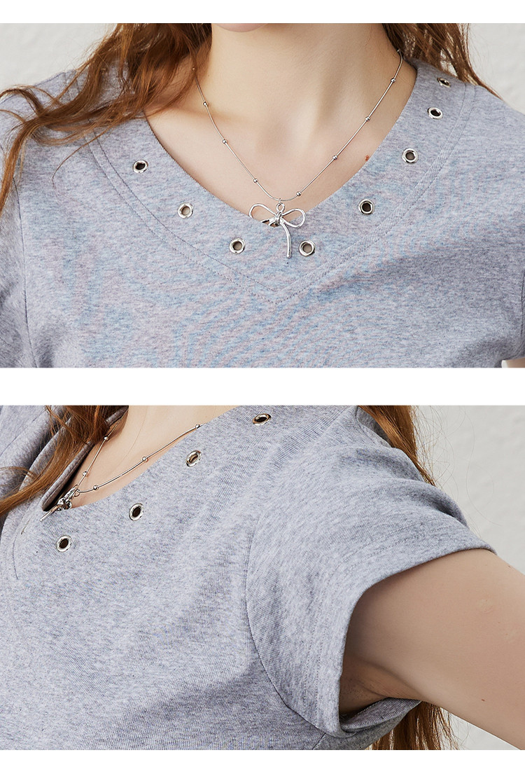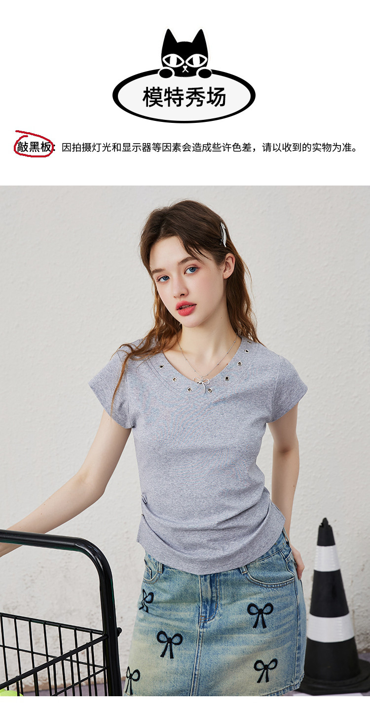 商品名称:V领修身显瘦弹力辣妹女式T恤夏季个性褶皱设计感短袖 475805