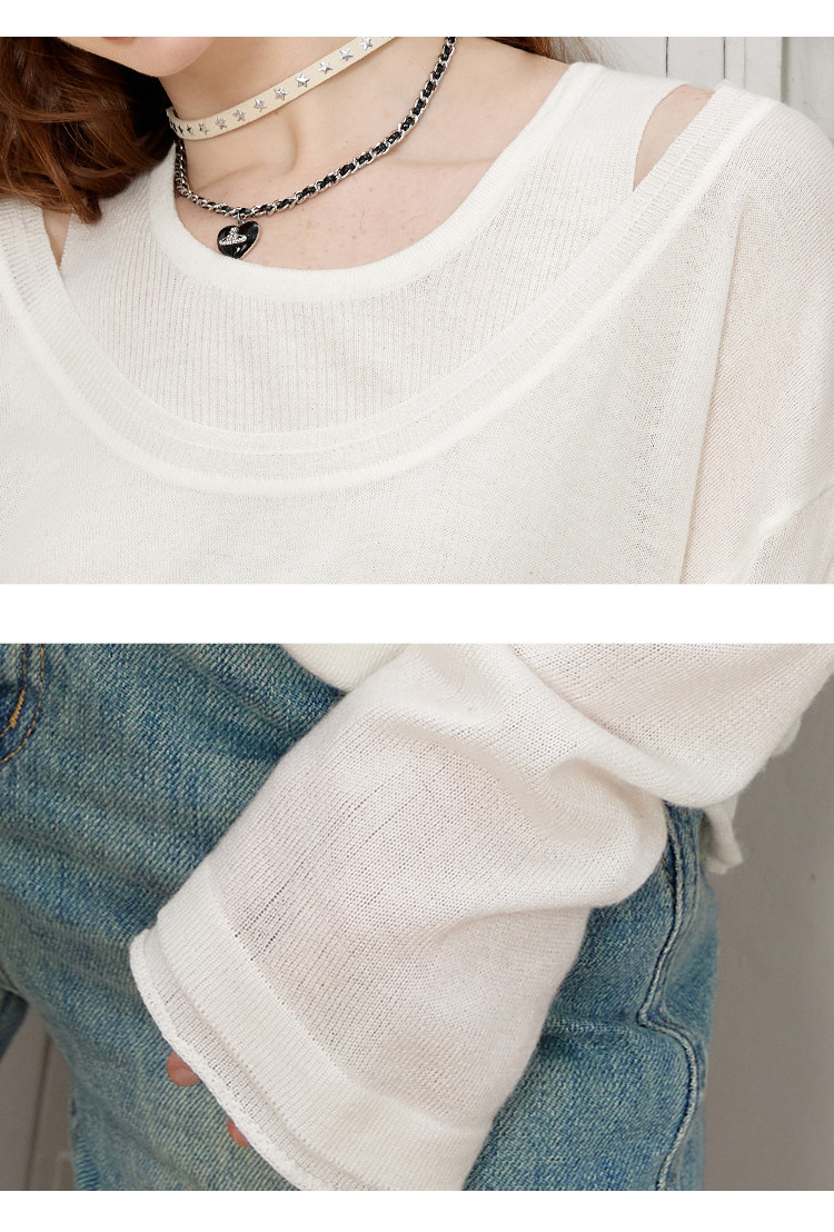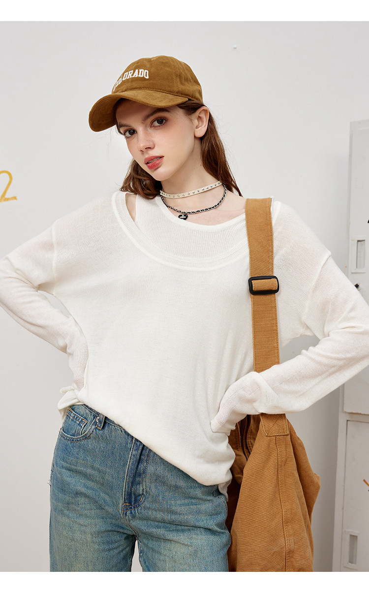 【春日浪漫】春夏款叠穿漏肩假两件简约女式宽松针织衫潮 831389