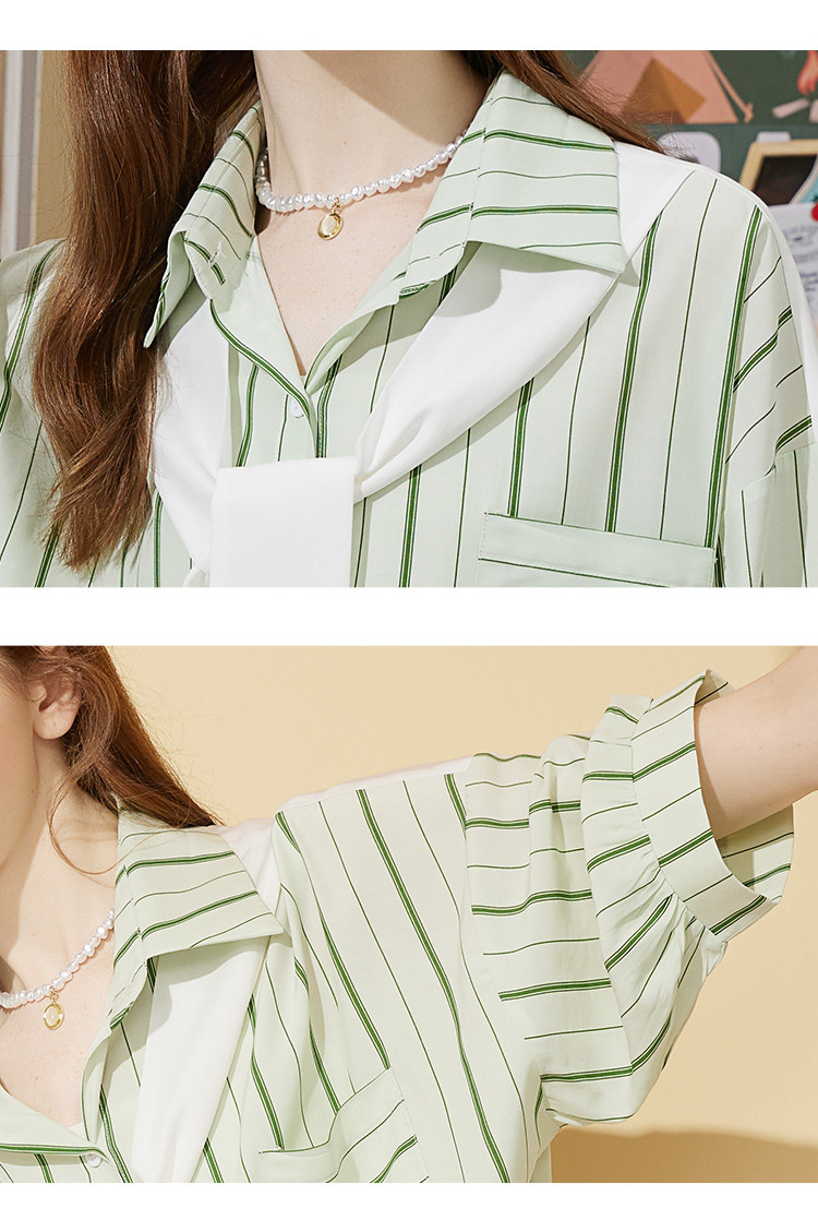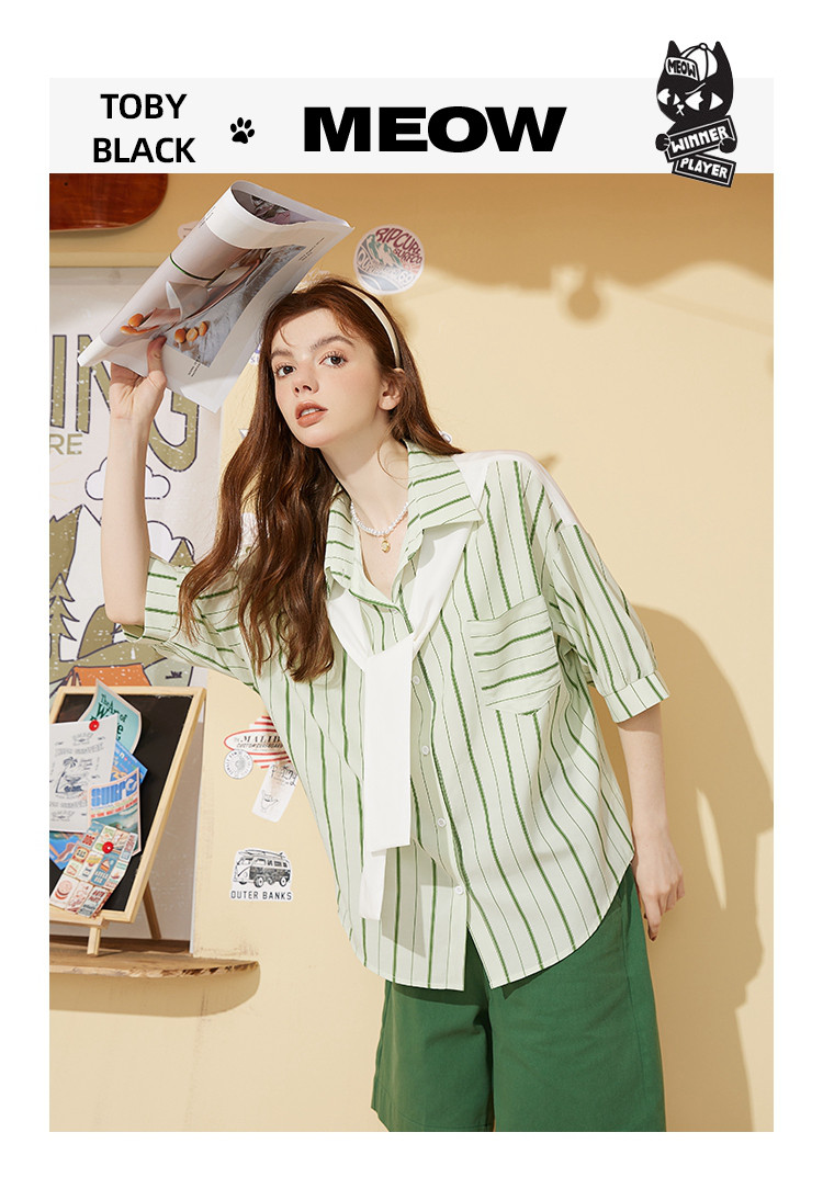 【小清新假两件】披肩设计宽松条纹女式衬衫夏季新短袖 156765