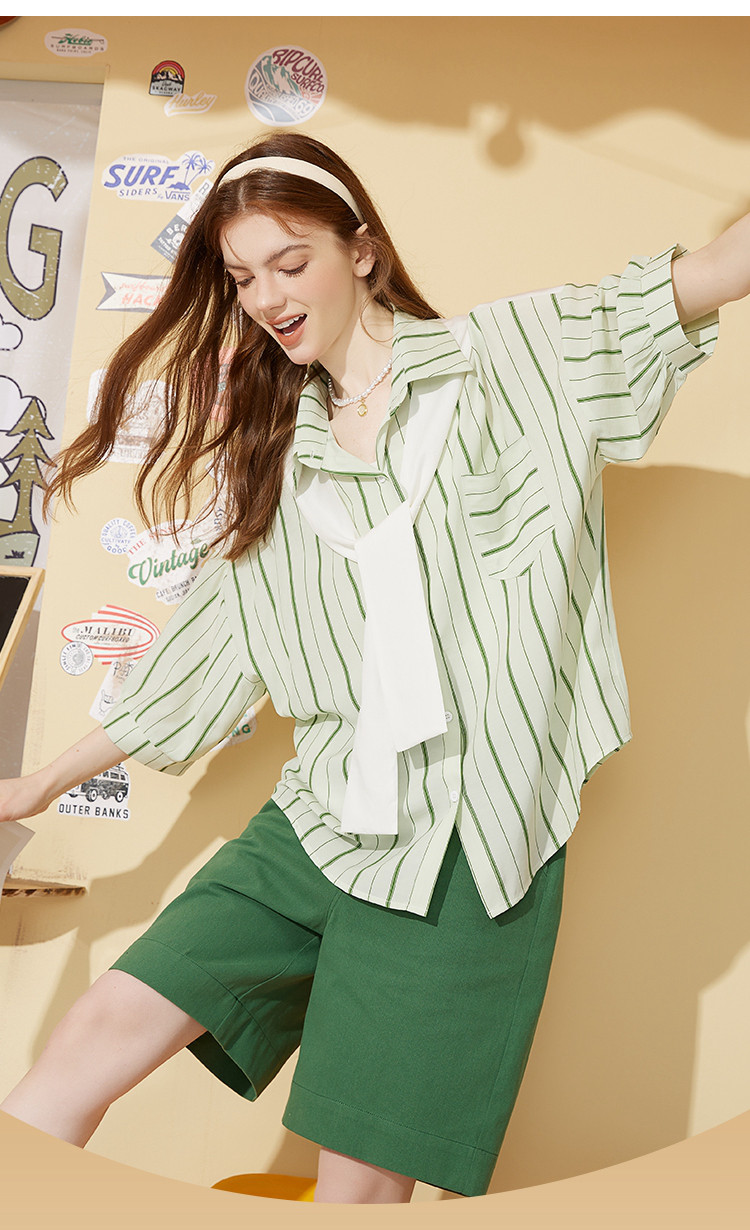 商品名称:【小清新假两件】披肩设计宽松条纹女式衬衫夏季新短袖 156765