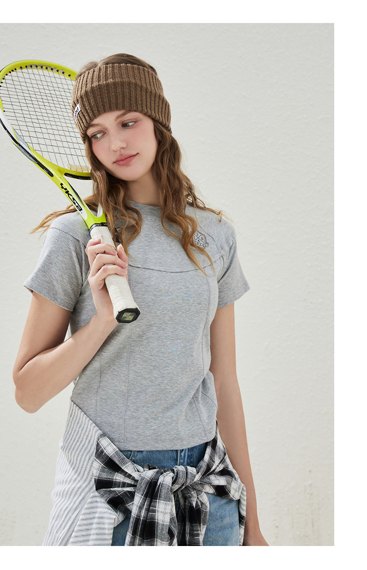 设计师款拼接设计感印花女式T恤夏季修身圆领短袖上衣 372765