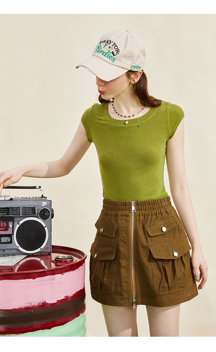 复古洗旧多口袋拉链短款牛仔裙夏季个性设计感半截裙 581661