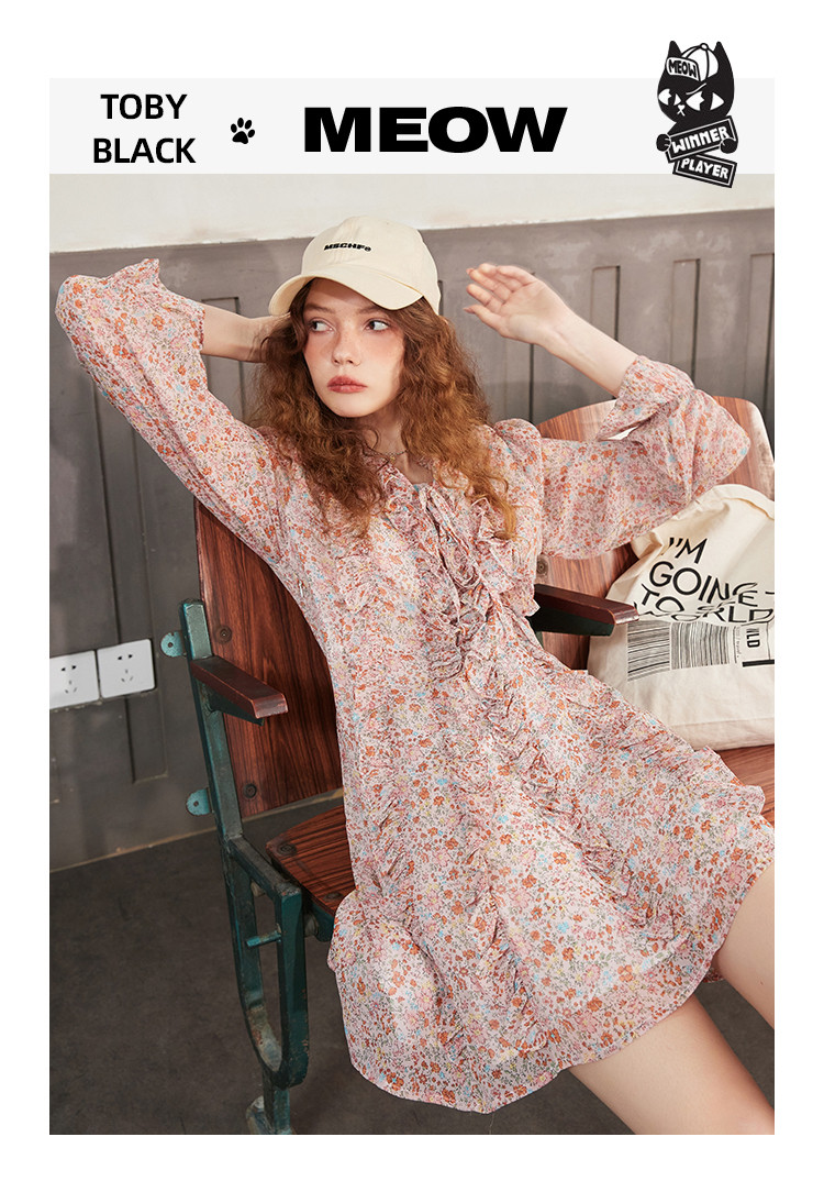 荷叶边个性碎花设计长袖裙夏季郊游休闲度假风气质连衣裙 402269