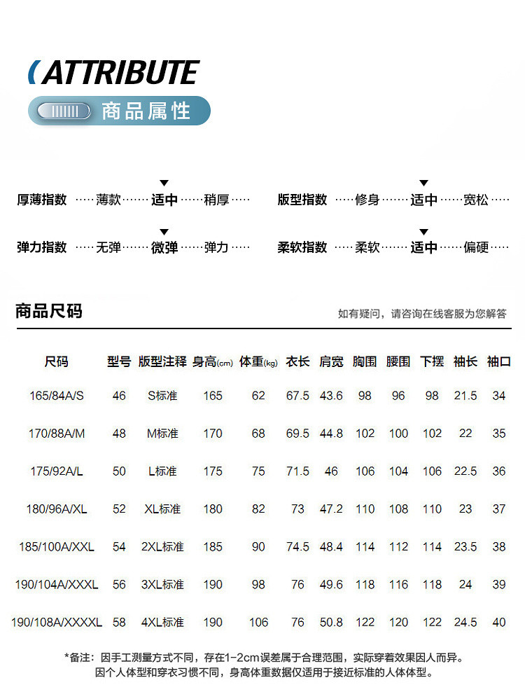 | 3XL(推荐91~98kg) | 76 | 49.6 | 116 | 24 | 118 | 118 | 190/104A |