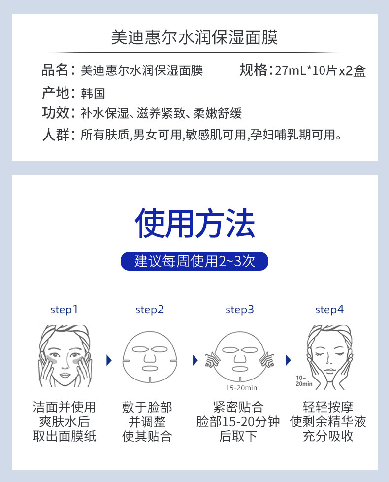 商品名称:美迪惠尔可莱丝面膜水库韩国水润针剂面膜女补水保湿10片*2盒