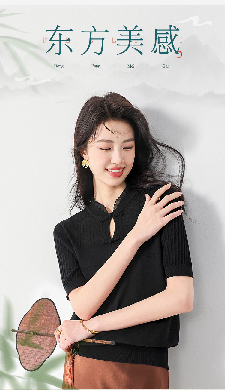 【国风】新中式盘扣含桑蚕丝针织衫女夏短袖T恤淑女衬衣上衣 091347