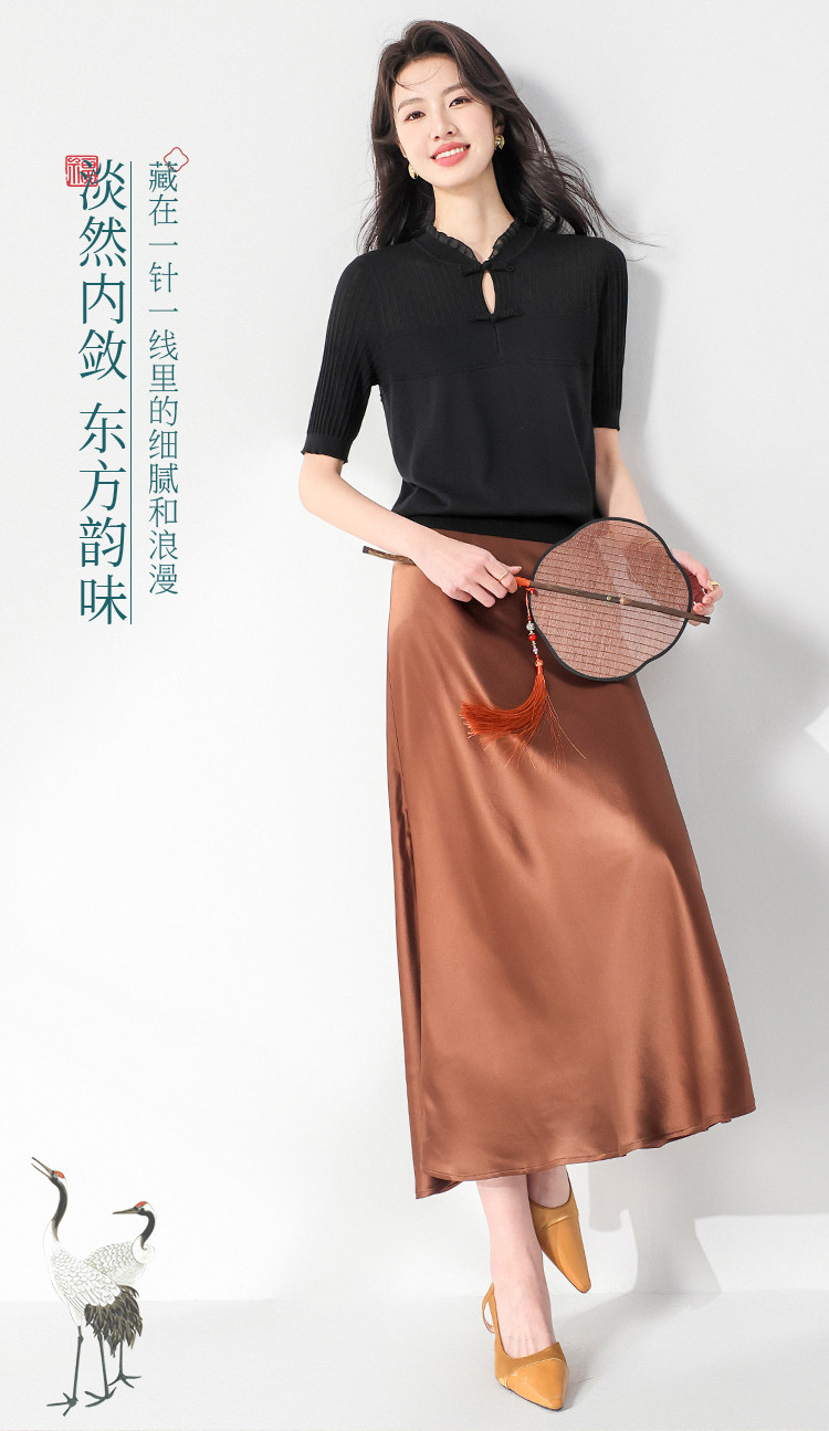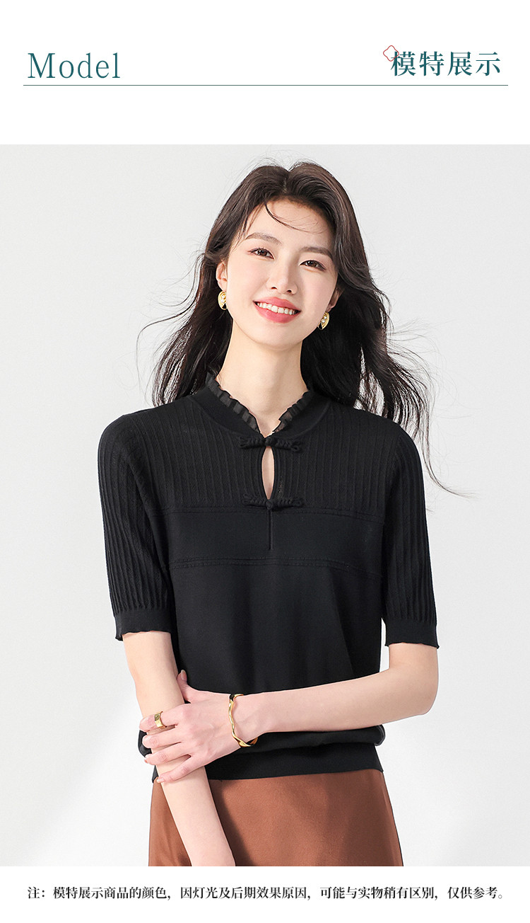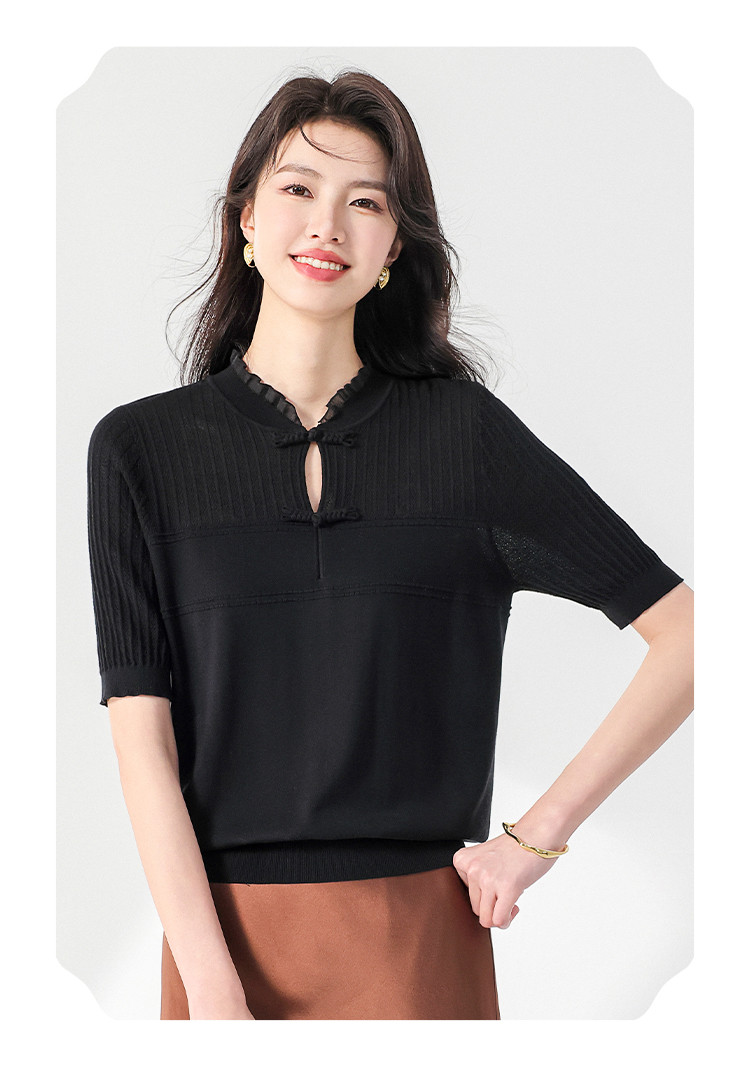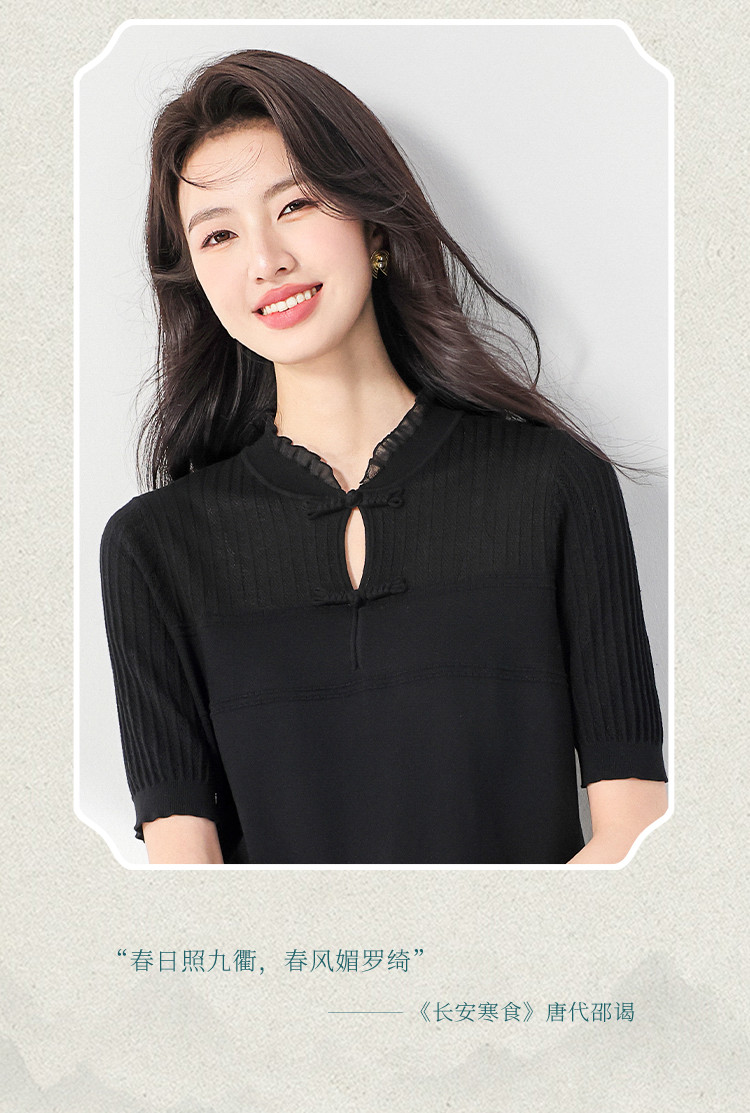 商品名称:【国风】新中式盘扣含桑蚕丝针织衫女夏短袖T恤淑女衬衣上衣 091347