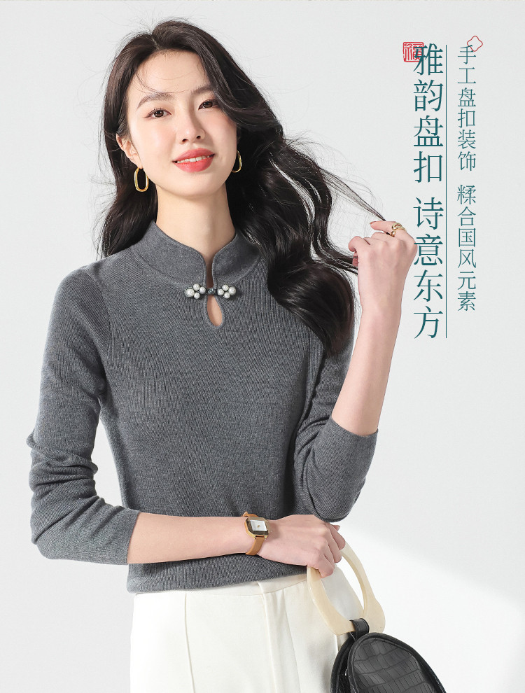 国风新中式轻薄透气含桑蚕丝立领针织打底衫夏款长袖T恤妈妈装 149907