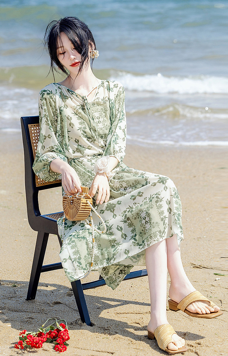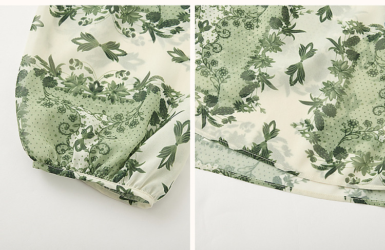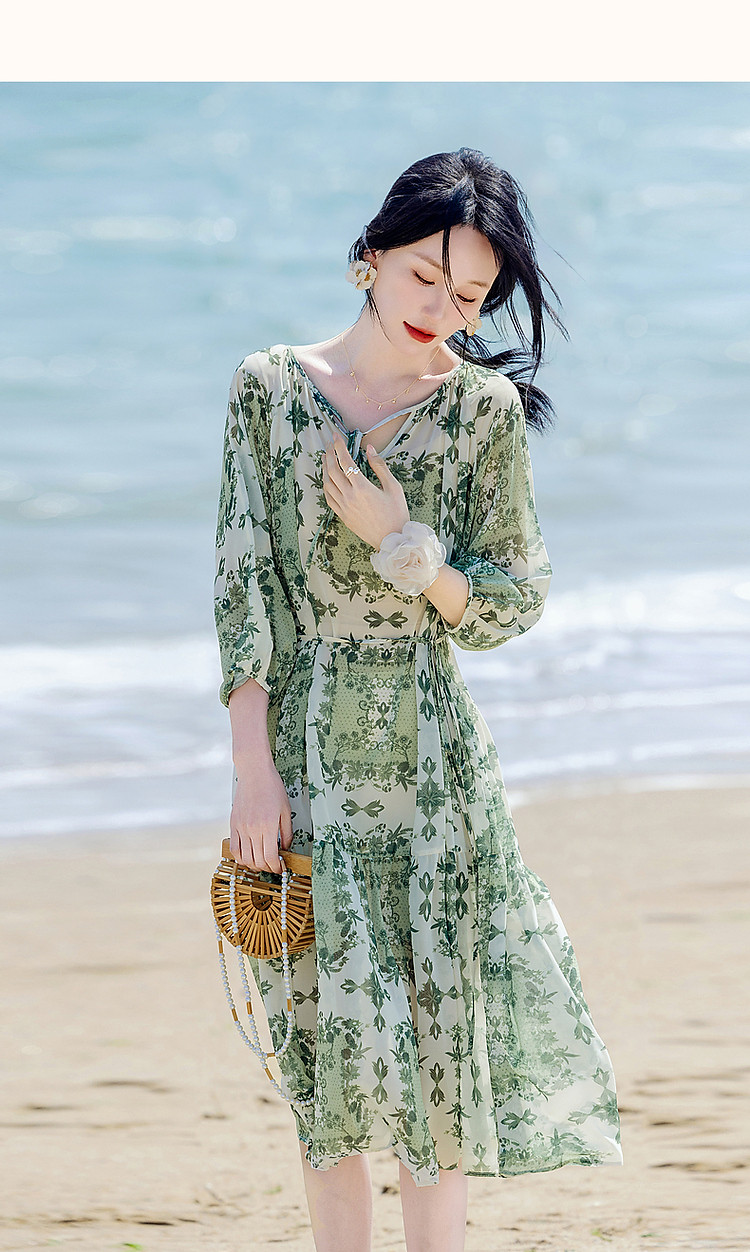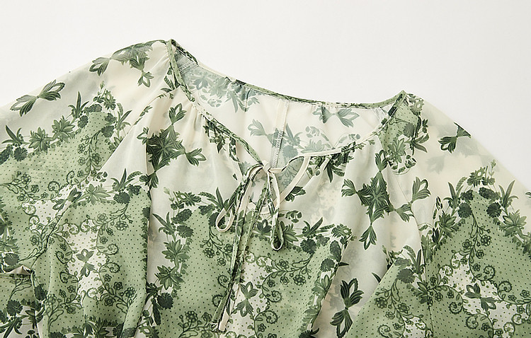 【奇迹华尔兹】夏轻盈舒适圆领植物印花优雅绑带雪纺连衣裙 737793