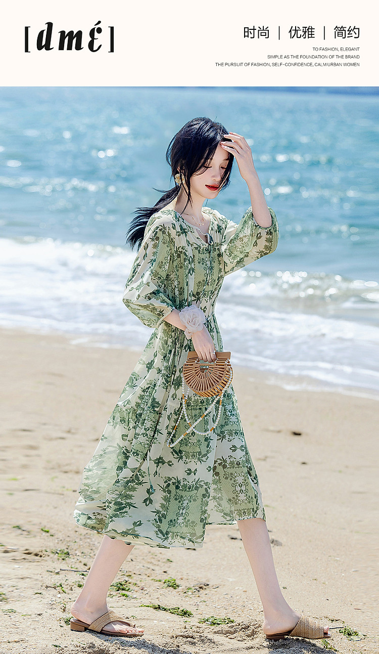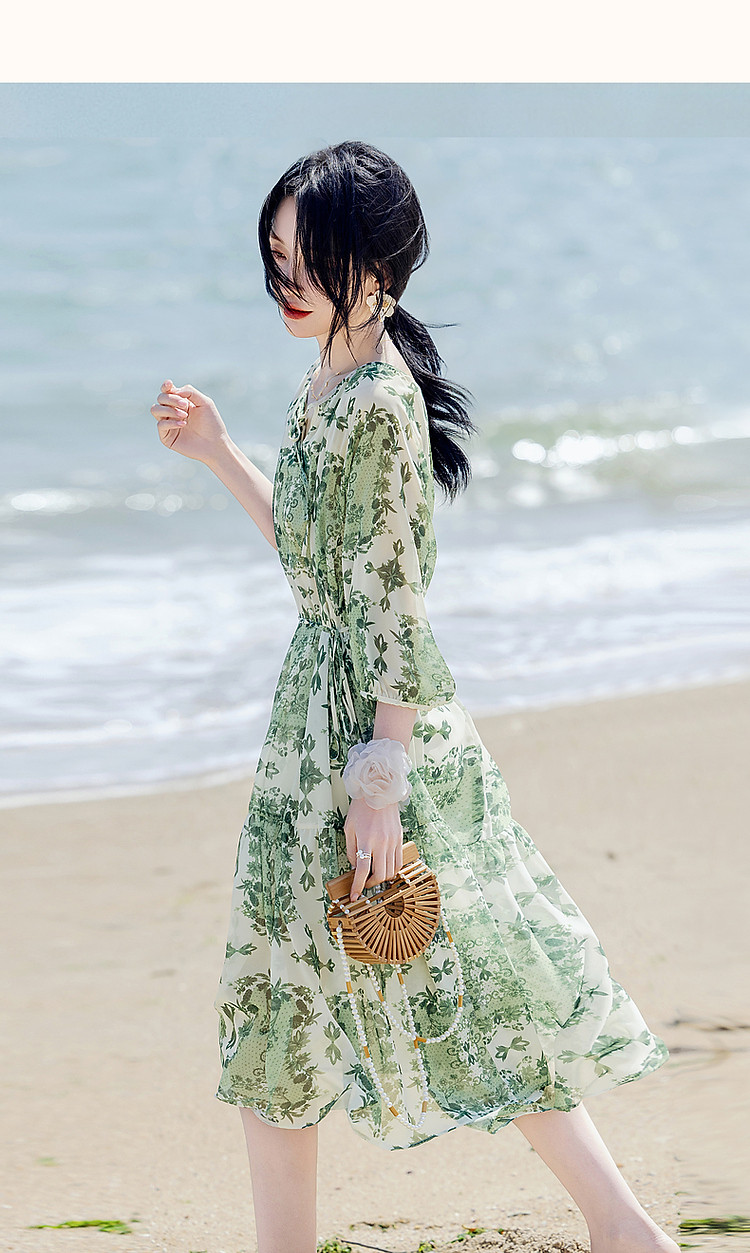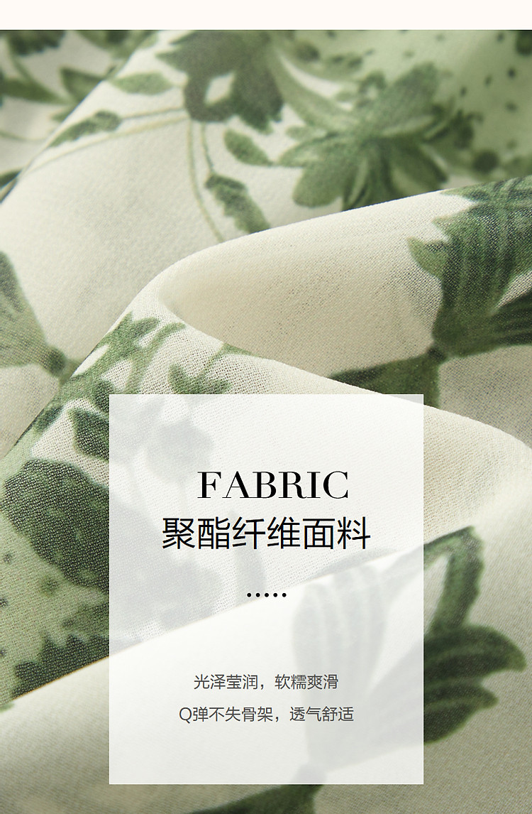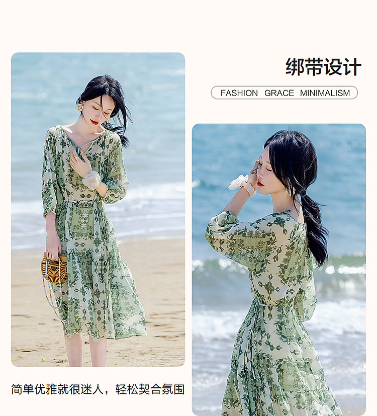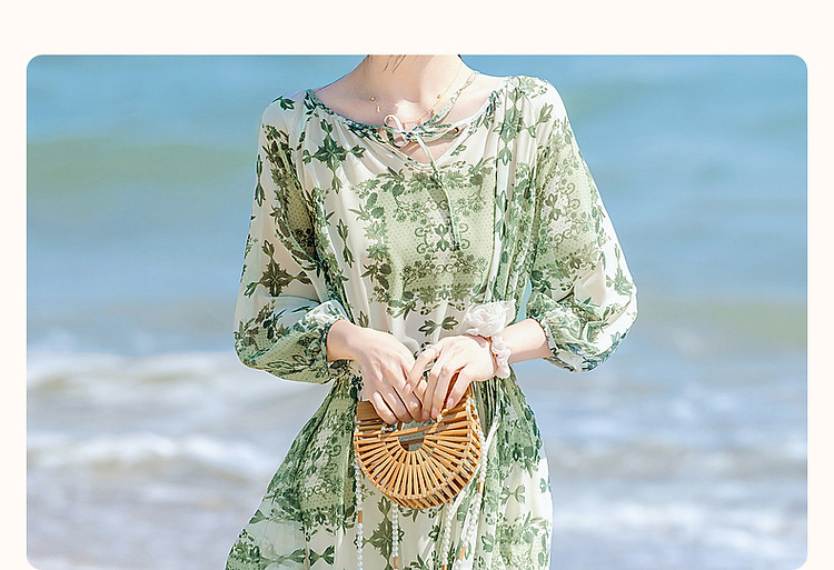 商品名称:【奇迹华尔兹】夏轻盈舒适圆领植物印花优雅绑带雪纺连衣裙 737793