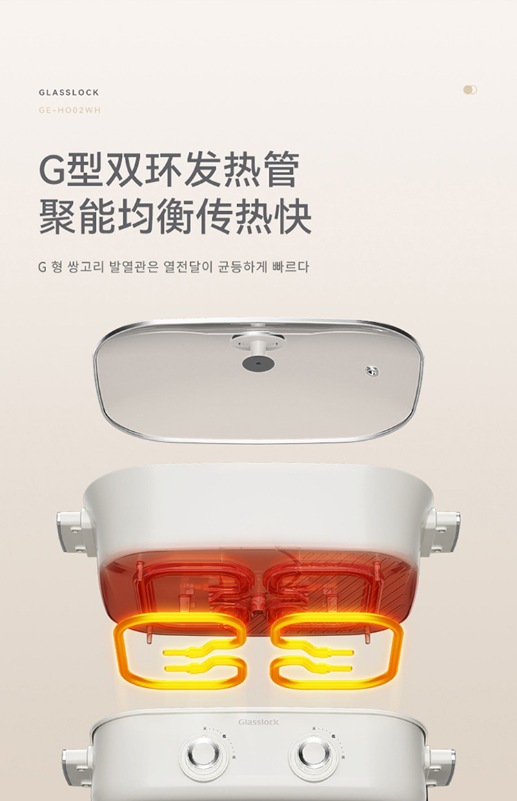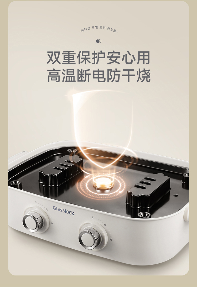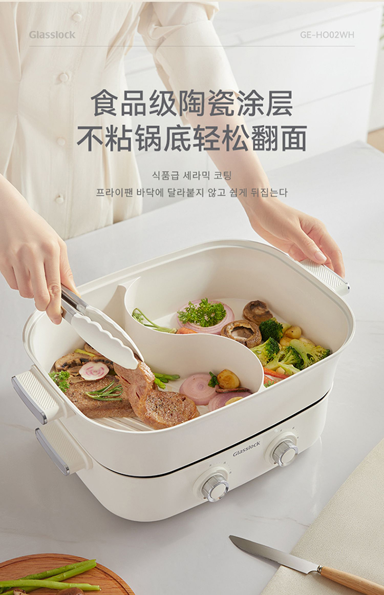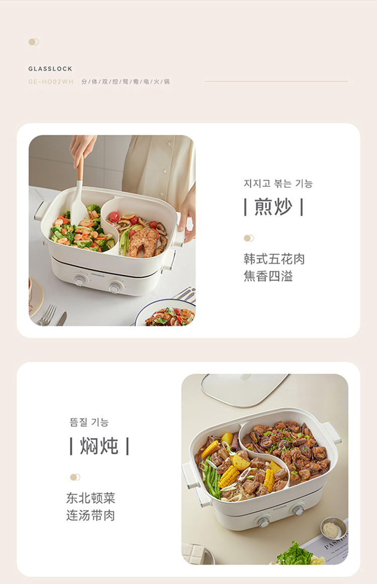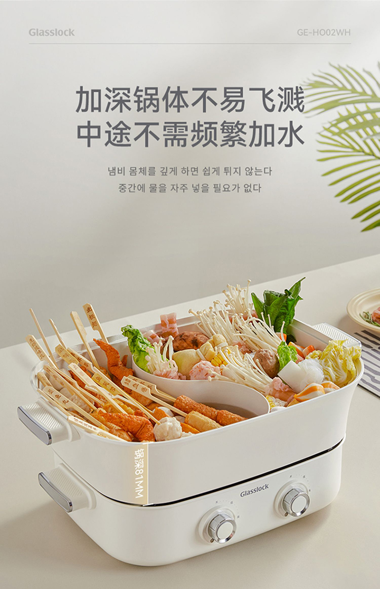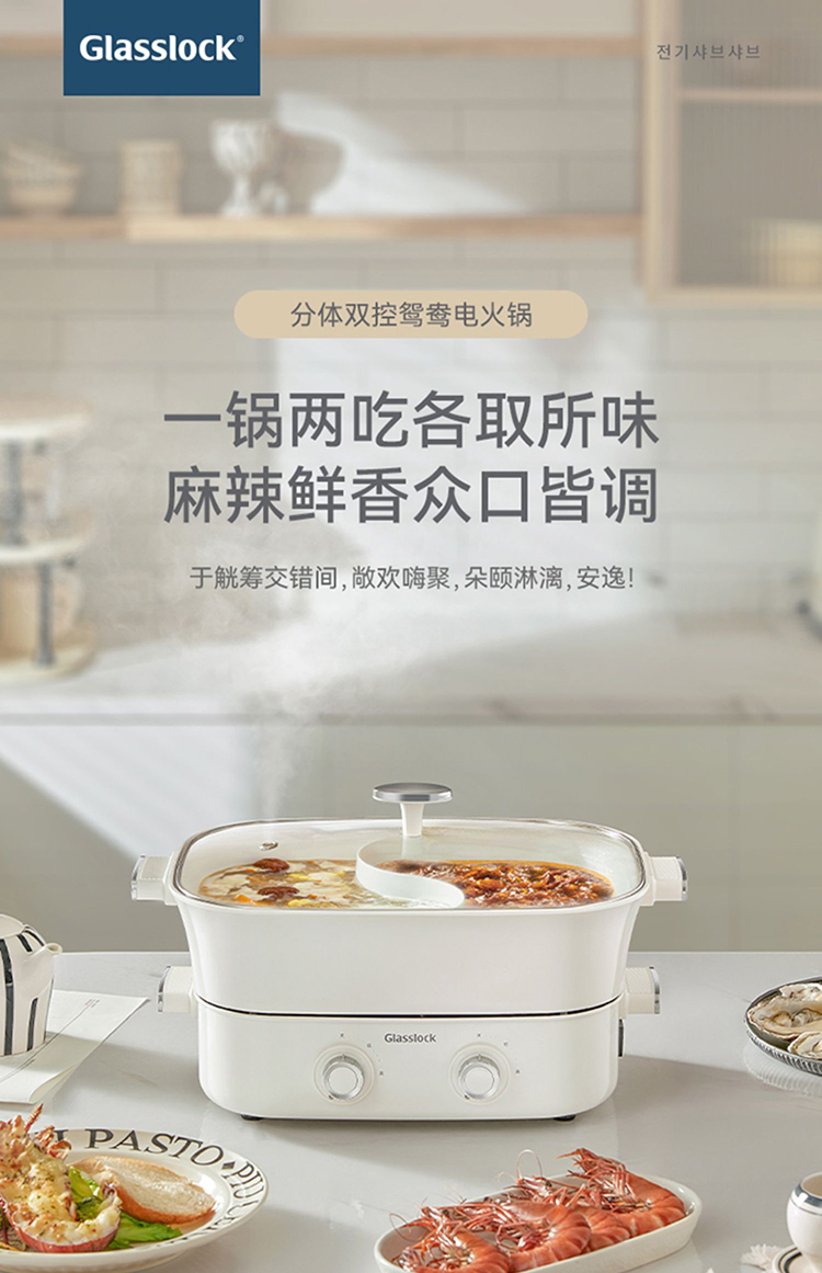 GLASSLOCK韩国品牌速沸电火锅6.5L鸳鸯锅大功率多用途锅电煮锅多功能锅分体式家用电热锅涮肉锅火锅锅具 2200W