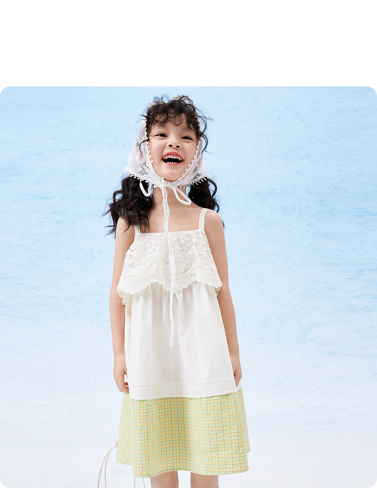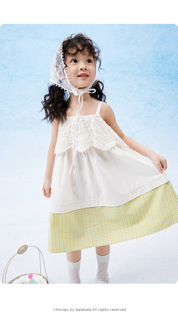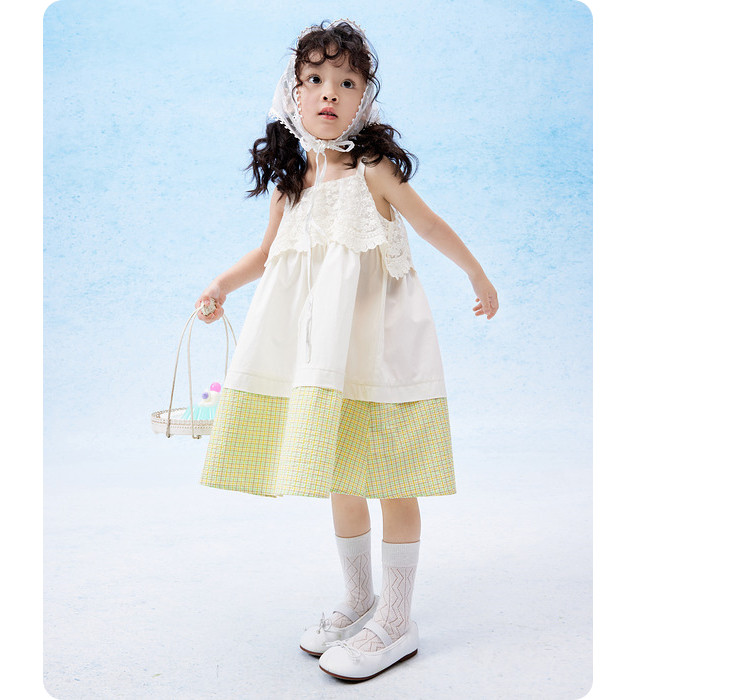 凉爽透气蕾丝格纹拼接儿童裙子夏装女童连衣裙时尚吊带裙高级感 912133