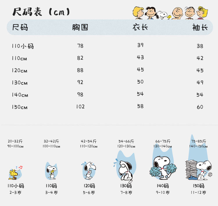 | 尺码 | 衣长(cm) | 身高(cm) | 袖长(cm) | 适合年龄 | 胸围(cm) | 号型 |