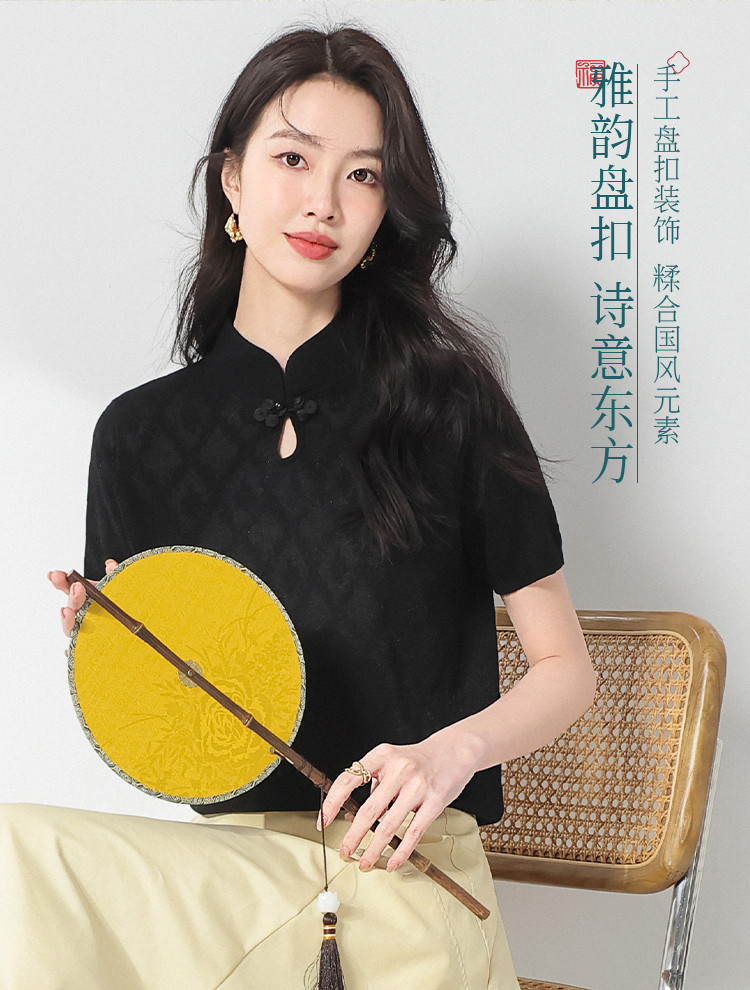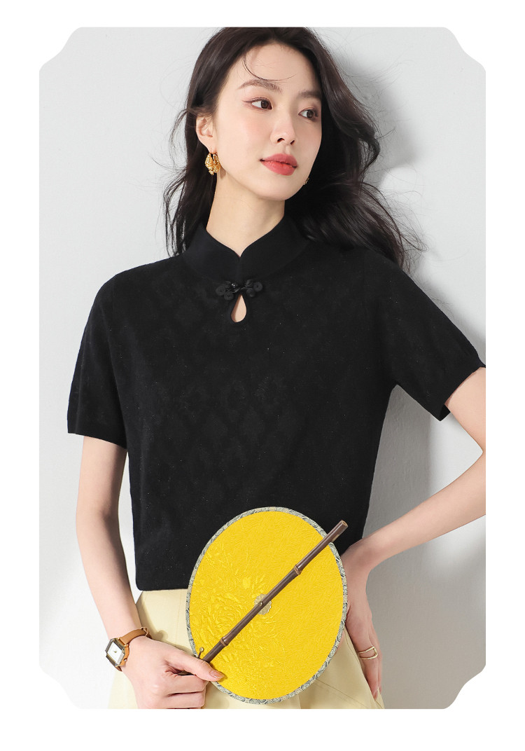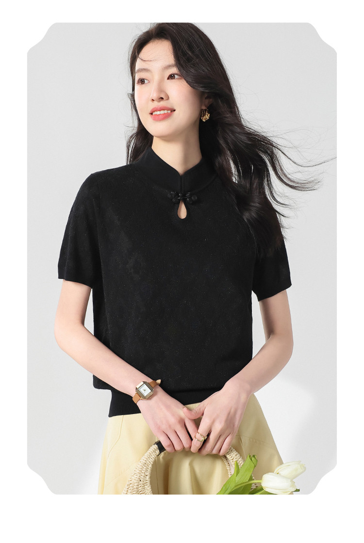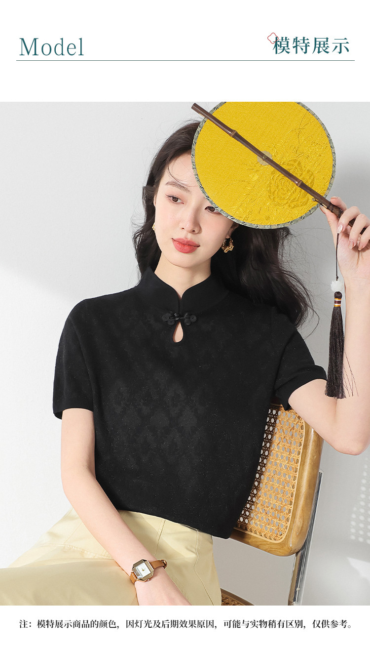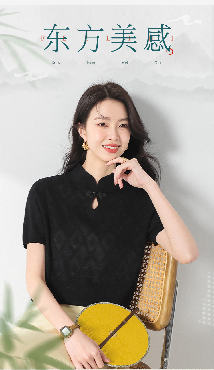 国风~轻薄透气含桑蚕丝立领打底衫短袖T恤针织衫女夏妈妈装上衣 268691