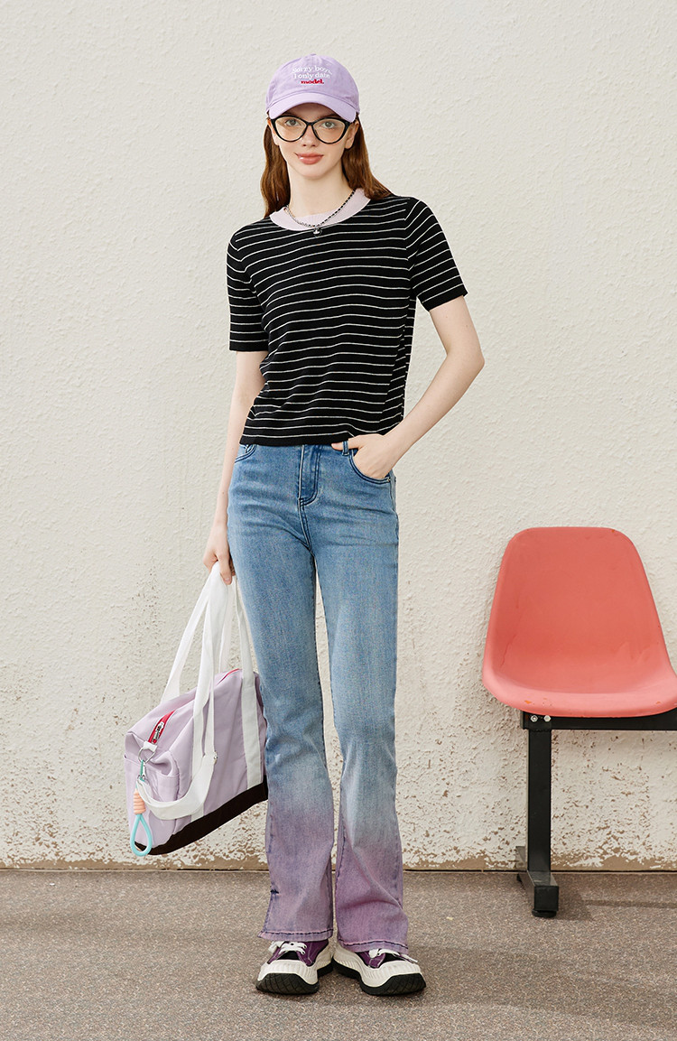 经典小清新条纹宽松休闲百搭女式针织衫夏季圆领短袖上衣 322973