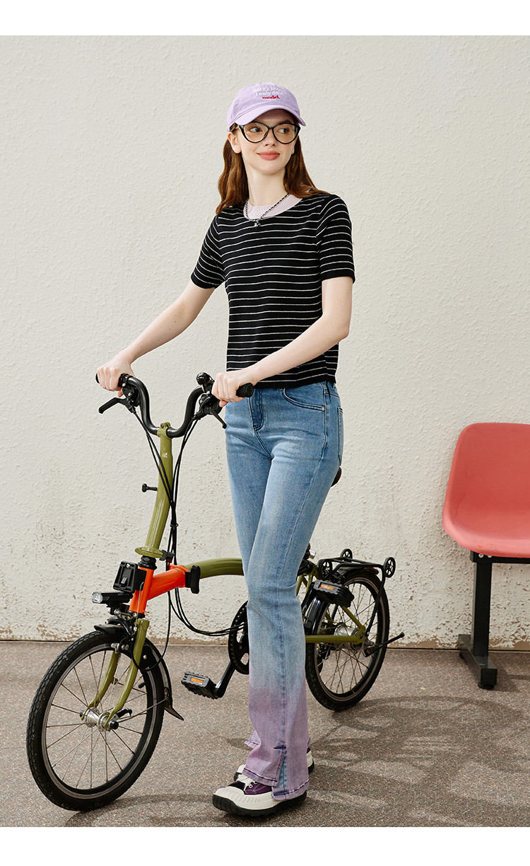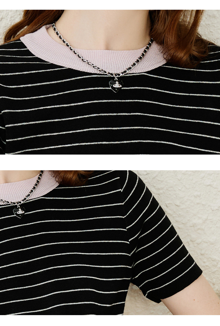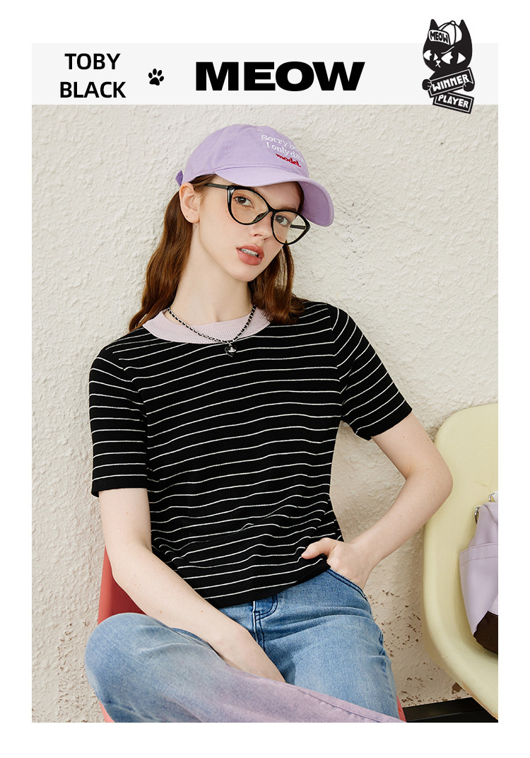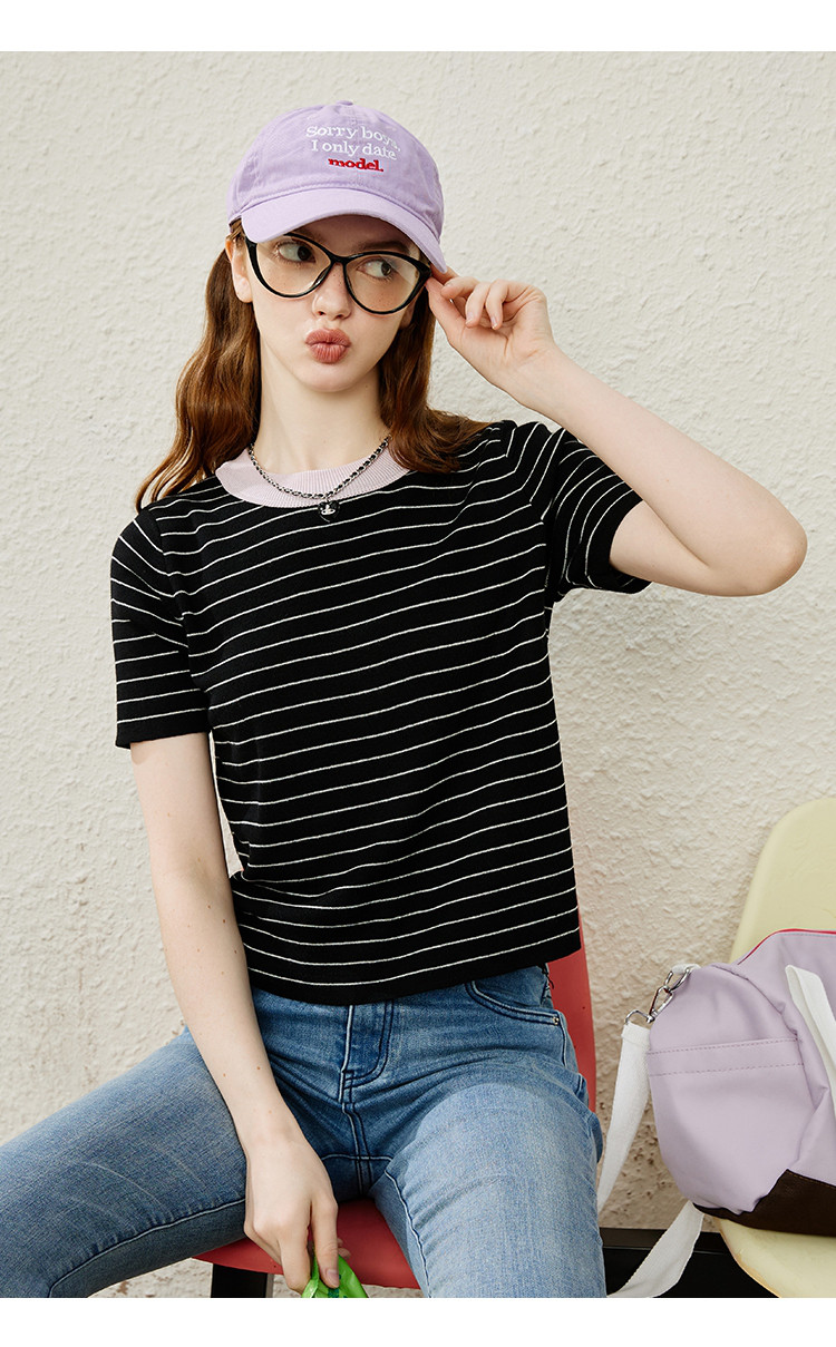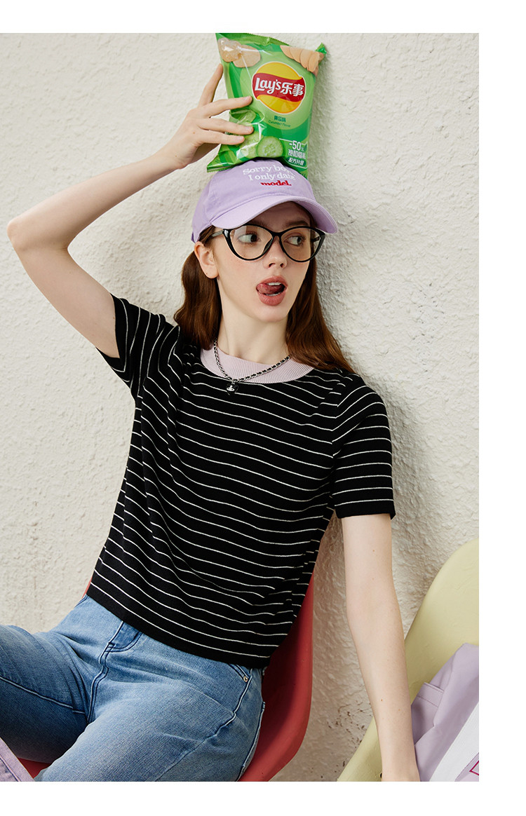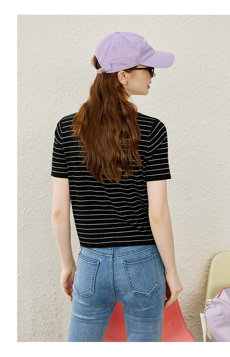 商品名称:经典小清新条纹宽松休闲百搭女式针织衫夏季圆领短袖上衣 322973