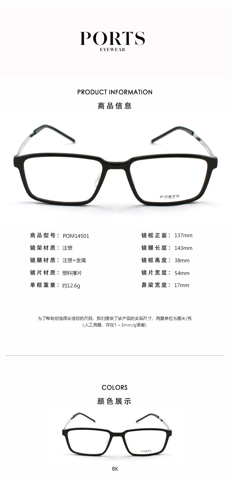 商品名称:PORTS男款商务男士注塑轻巧舒适光学架POM14501 265162