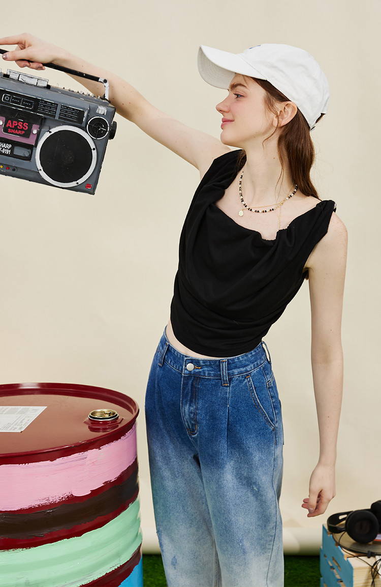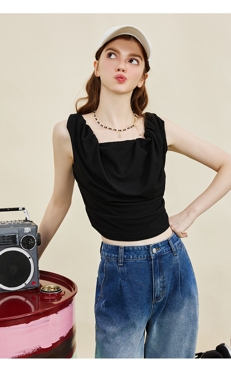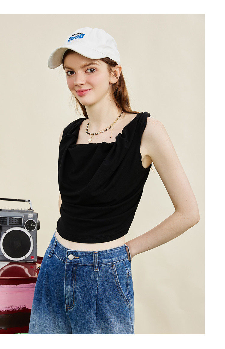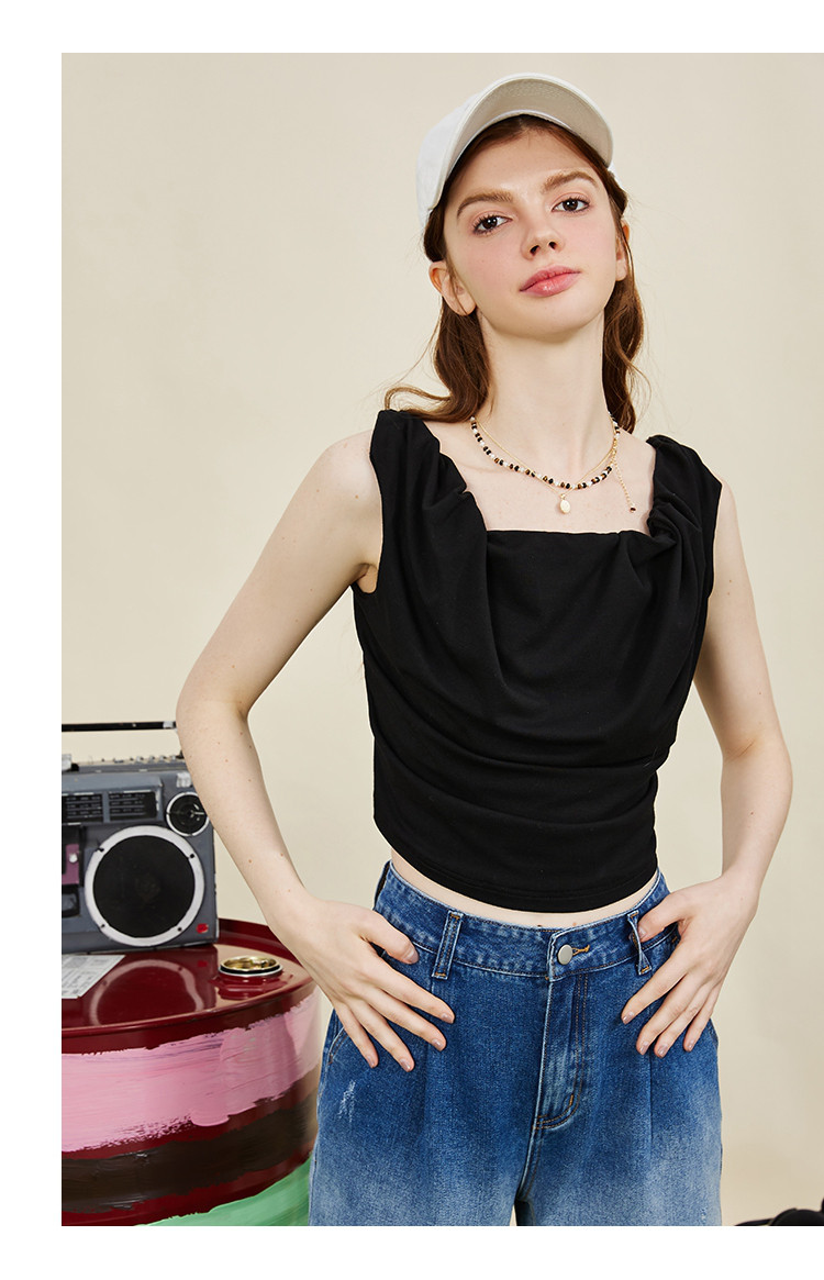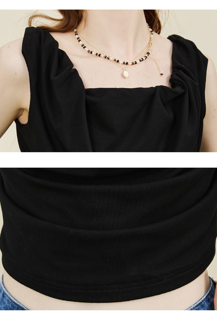 设计师款纽皱个性短款背心夏季纯色休闲小众吊带女式T恤 606749