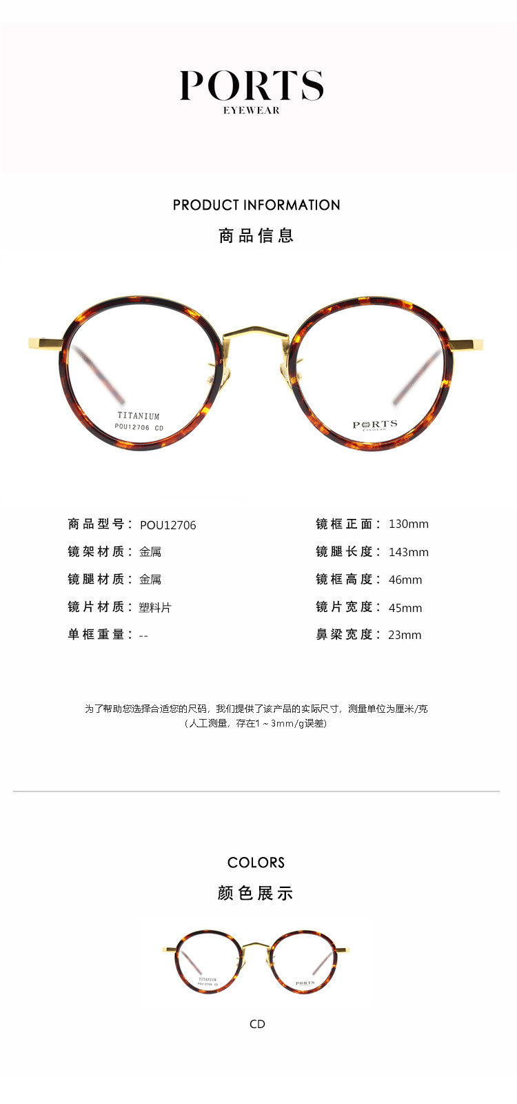 商品名称:PORTS日常女款时尚休闲金属钛眼镜架POU12706 743754