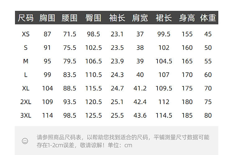 | 尺码 | 裙长(cm) | 肩宽(cm) | 腰围(cm) | 臀围(cm) | 袖长(cm) | 胸围(cm) | 号型 |