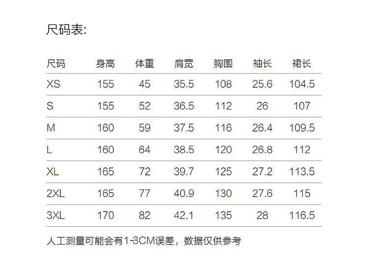 | 尺码 | 裙长(cm) | 肩宽(cm) | 腰围(cm) | 袖长(cm) | 胸围(cm) | 号型 |