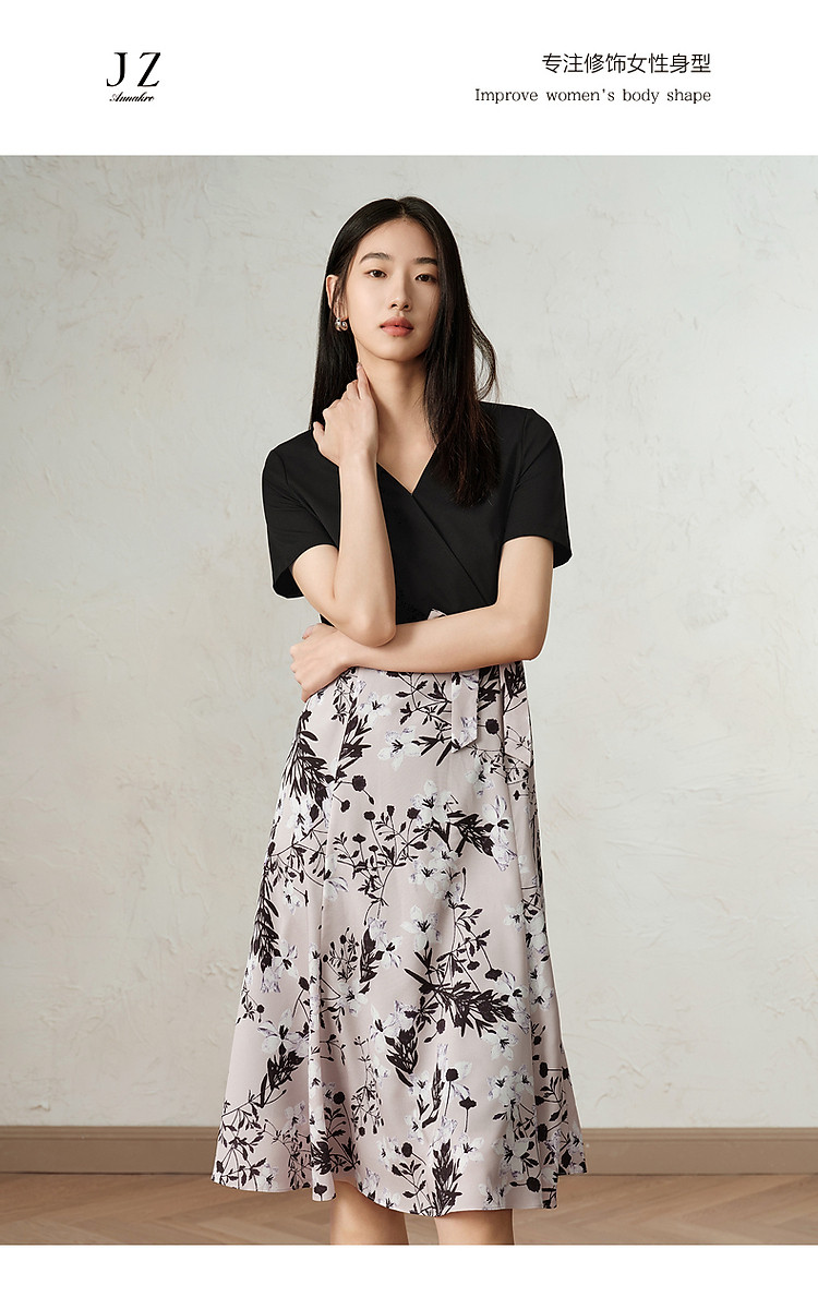 玖姿旗下安娜蔻系列气质针织雪纺拼接撞色假两件连衣裙女春季 990540