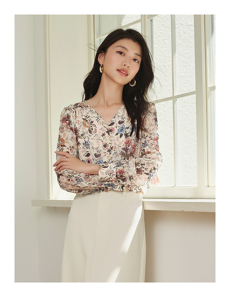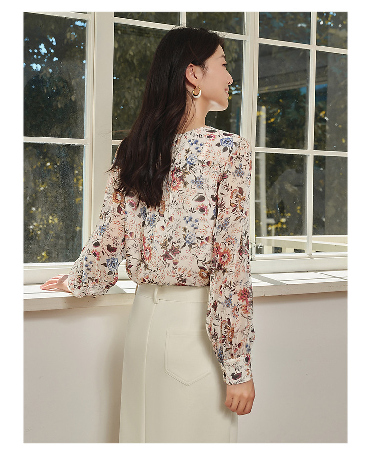 玖姿旗下安娜蔻系列真丝艺术感印花V领上衣衬衫女 306956