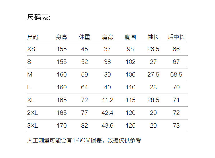 | 尺码 | 衣长(cm) | 肩宽(cm) | 腰围(cm) | 袖长(cm) | 胸围(cm) | 下摆围(cm) | 号型 |