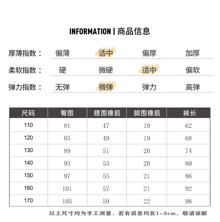 | 尺码 | 身高(cm) | 腰围(cm) | 裤长(cm) | 臀围(cm) | 适合年龄 | 号型 |