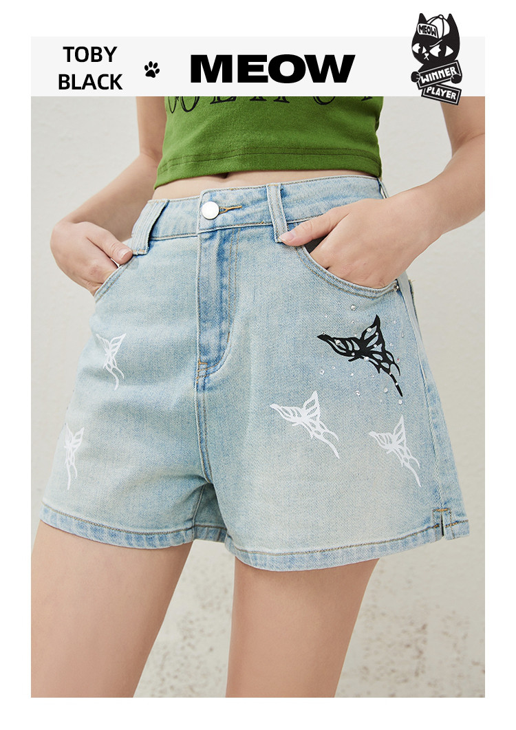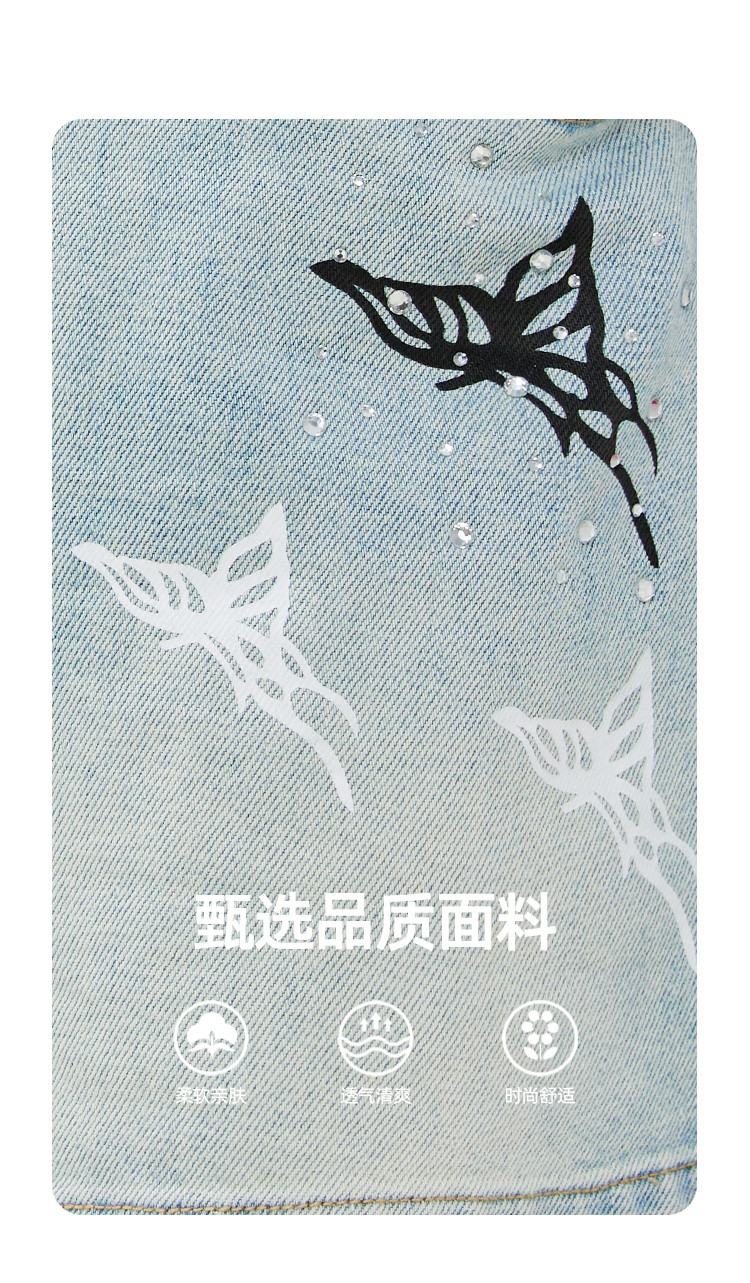 商品名称:个性镶钻蝴蝶图案设计短款直筒裤夏季高腰休闲女式牛仔裤 659997