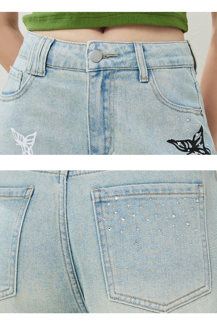 个性镶钻蝴蝶图案设计短款直筒裤夏季高腰休闲女式牛仔裤 659997