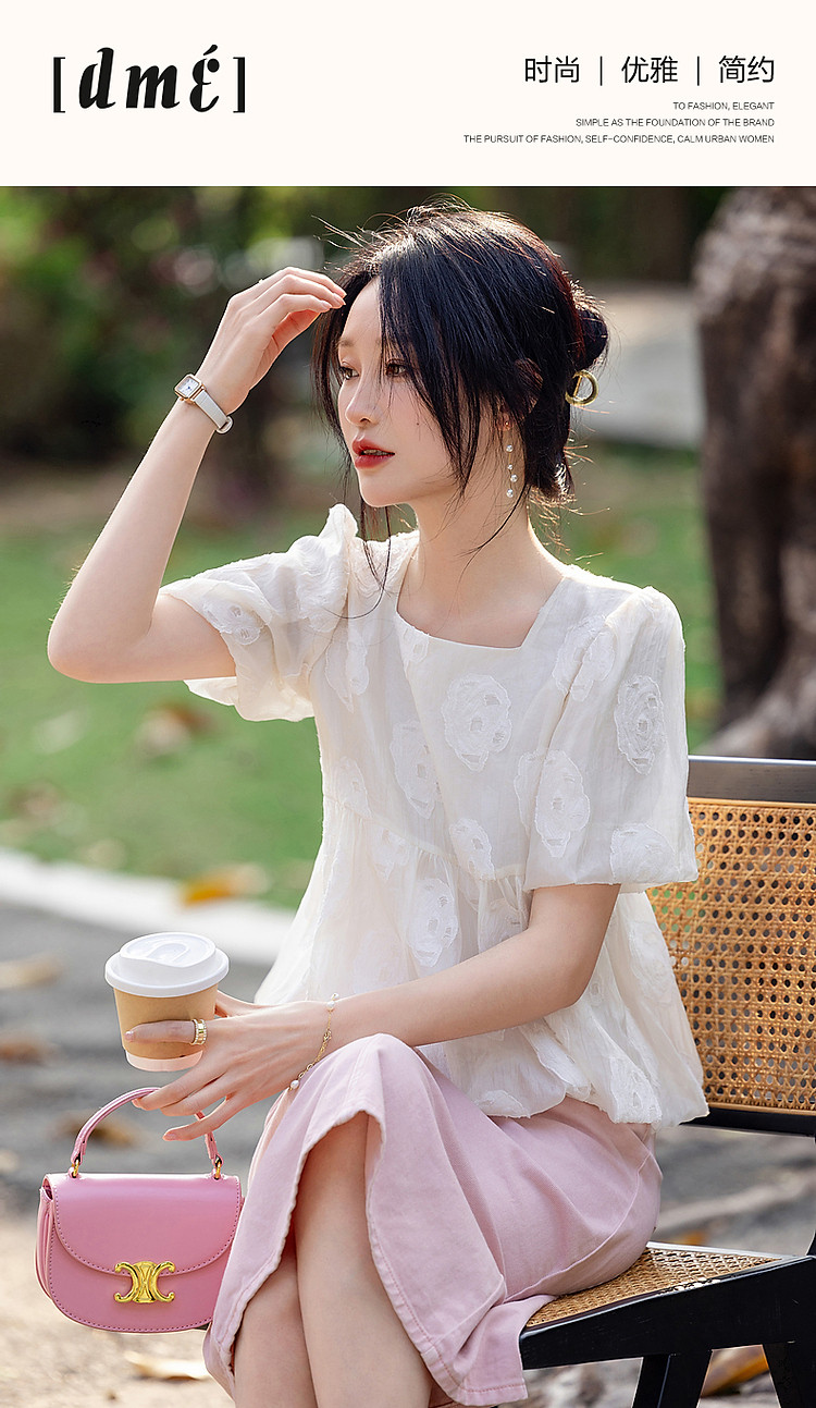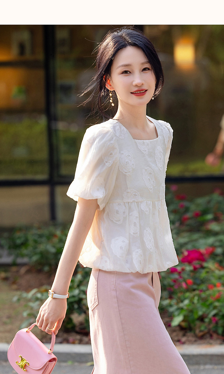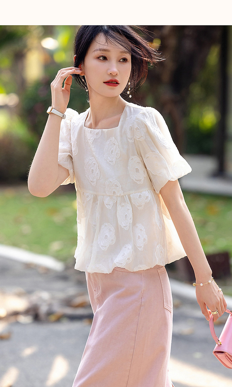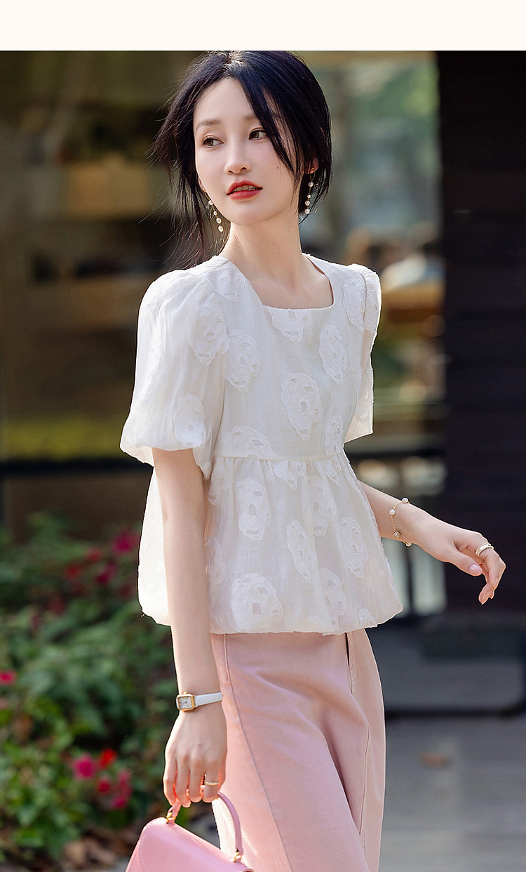 商品名称:【花间绮梦】夏法奢剪花娃娃衫方领衬衫泡泡袖舒适藏肉衬衣女上衣 980865